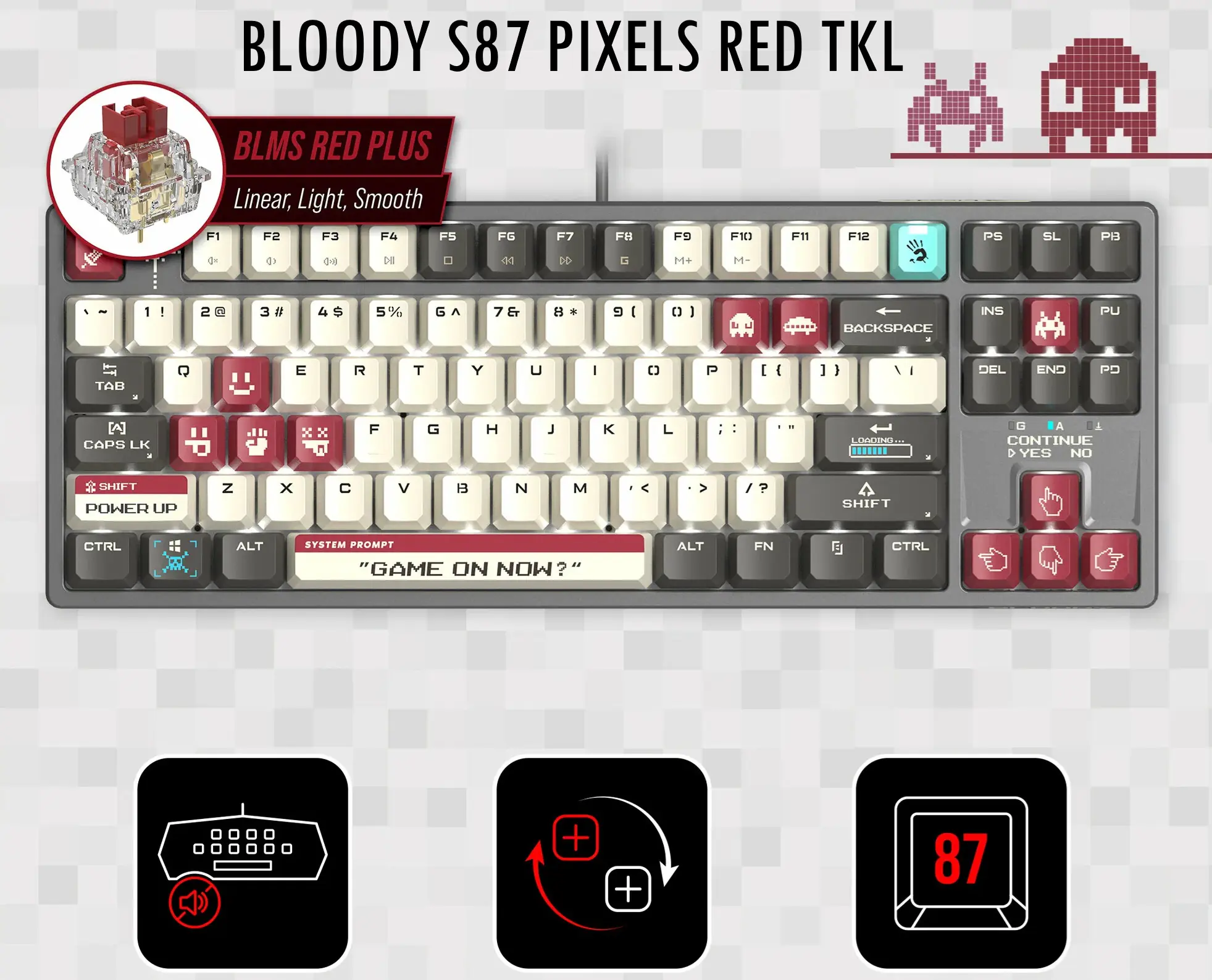 BLOODY S87 PIXELS RED TKL Gaming Keyboard – 87 Keys, RGB, Red BLMS Switch, Hot-Swappable, White Backlit, 4M Onboard Memory, PBT Keycaps, N-Key Rollover, Wired USB
