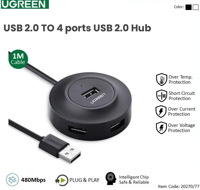 UGREEN USB 2.0 Hub 4 Ports 20277 Black – 480Mbps Transfer, Micro USB Power, LED Indicator, 1M Cable, Supports 10TB HDD, Plug & Play, Overload Protection