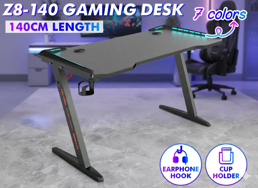 Z8-140 Z-Shaped RGB Gaming Desk – 140×60×73 cm Carbon-Fibre Surface, Dual Cable Grommets, Cup & Headphone Holders, Steel Frame Stability, Customizable RGB Edge Lighting