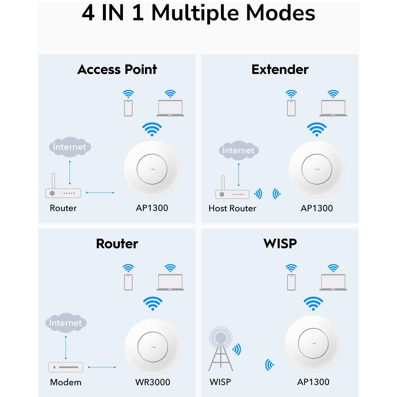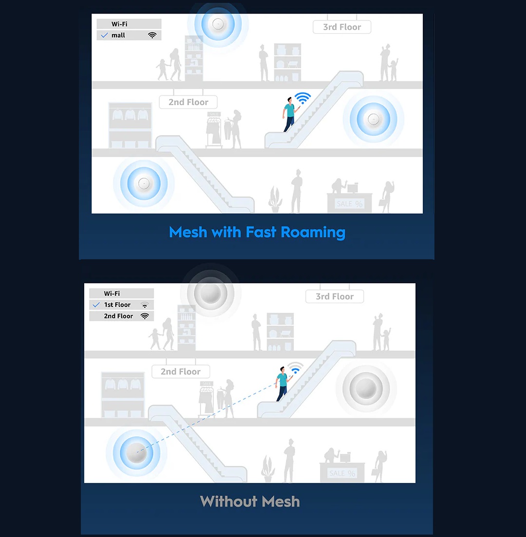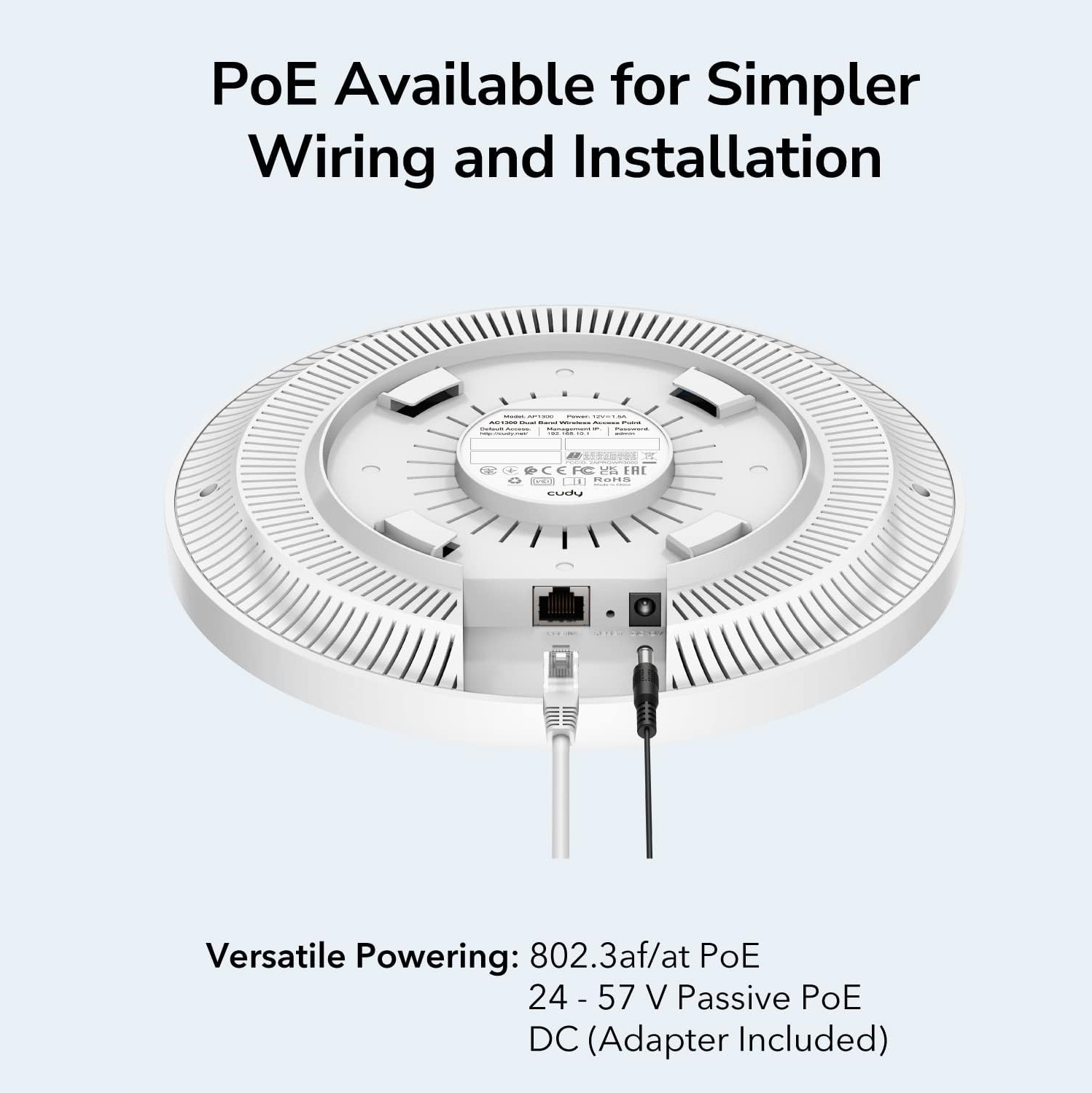 - Easy Install with the included mounting kits. Cudy AP1300 provides flexible and convenient installation methods, including ceiling installation and wall-mount installation, which is convenient for customers to choose different installation methods according to the installation environment.