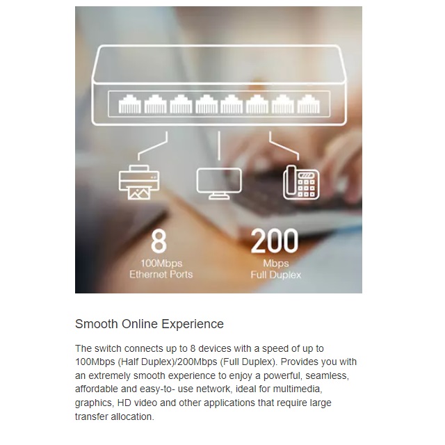 - Connect Up to 8 Devices: Each port supports speeds up to 100Mbps (Half Duplex) or 200Mbps (Full Duplex) for a seamless and powerful network experience, perfect for multimedia and HD video applications.
