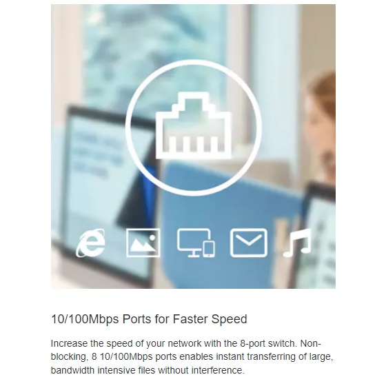 - 8-Port Switch: Instantly transfer large, bandwidth-intensive files with 8 non-blocking 10/100Mbps ports, ensuring smooth performance.