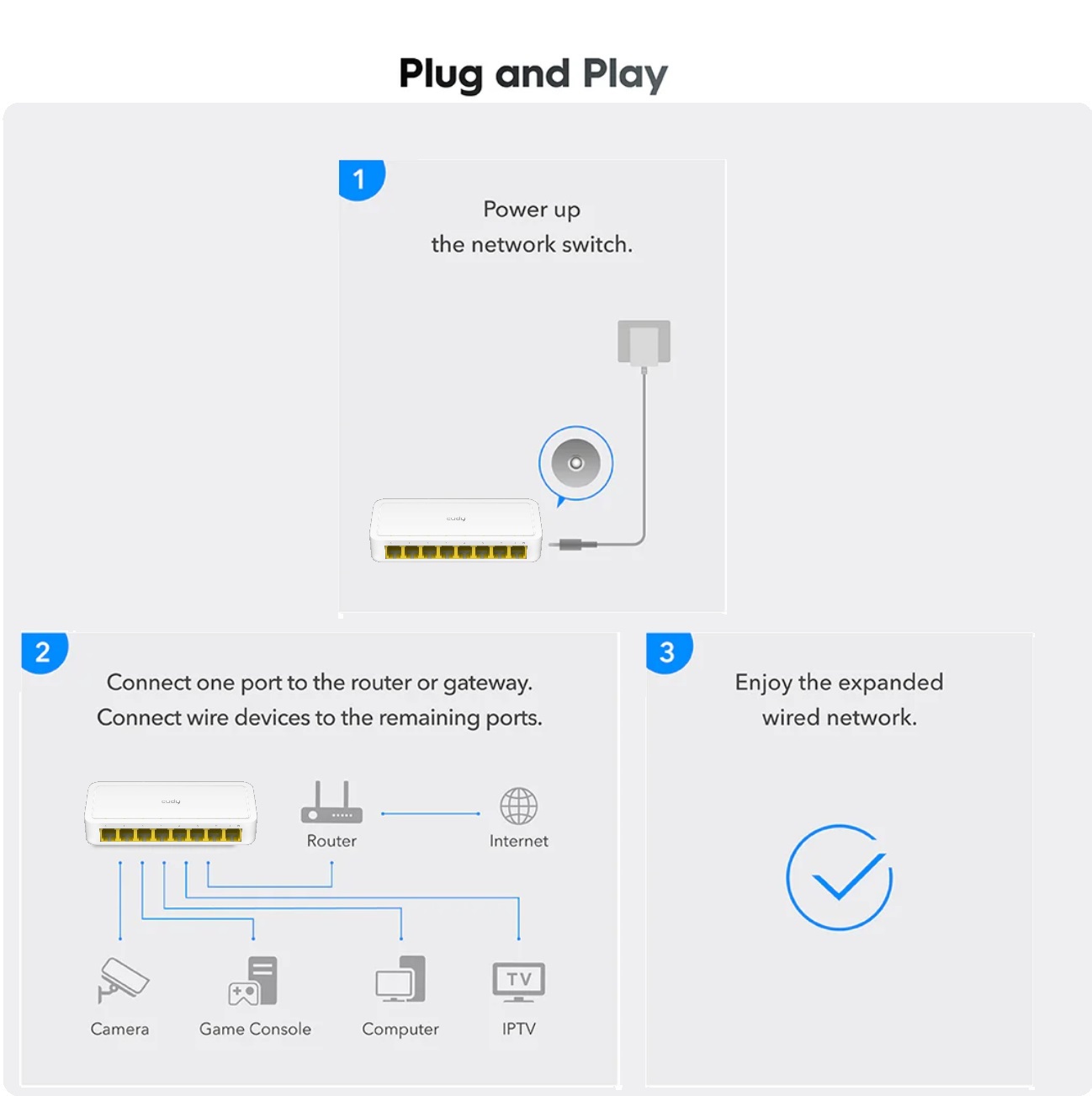 CUDY GS108D Gigabit RJ45 8-Port Desktop Switch ; 10/100/1000 Mbps Non-blocking Ethernet Ports ; 170 meters of Gigabit Transmission ; A Plug and Play Network Hub ; Wall Mounting | BLACK | NO WARRANTY