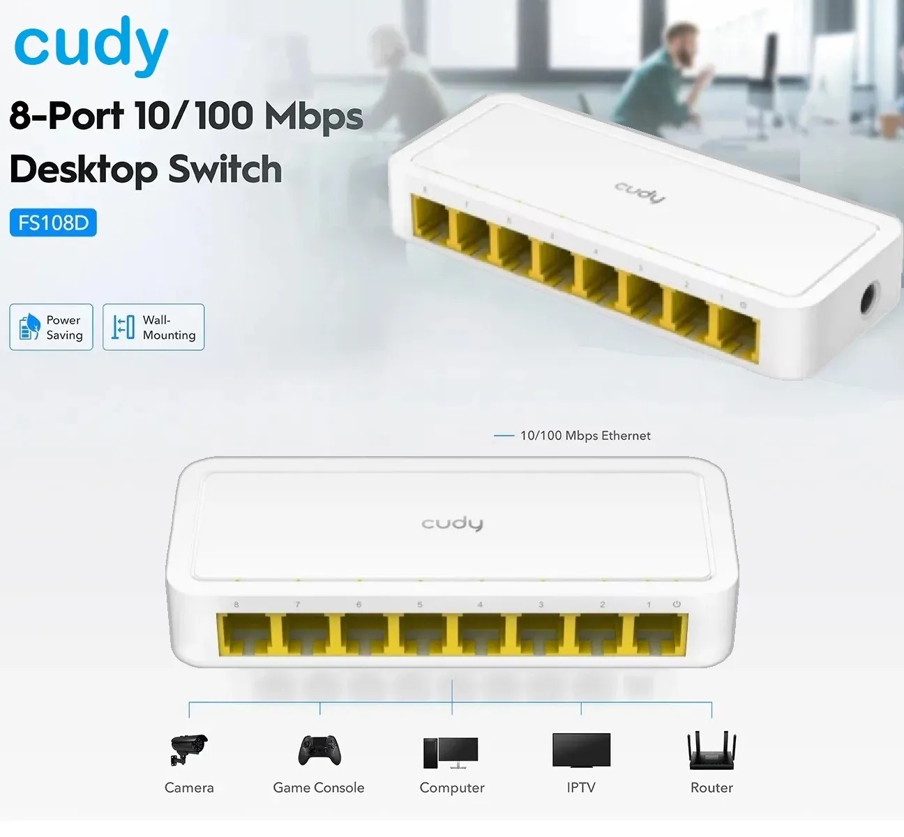 CUDY FS108D 8-Port Desktop Switch : Speeds up to 100Mbps (Half Duplex) or 200Mbps IEEE 802.3x (Full Duplex) ; Non-Blocking Architecture ; Auto MDI/MDIX ; Connect Up to 8 Devices ; Plug and Play | WHITE | NO WARRANTY