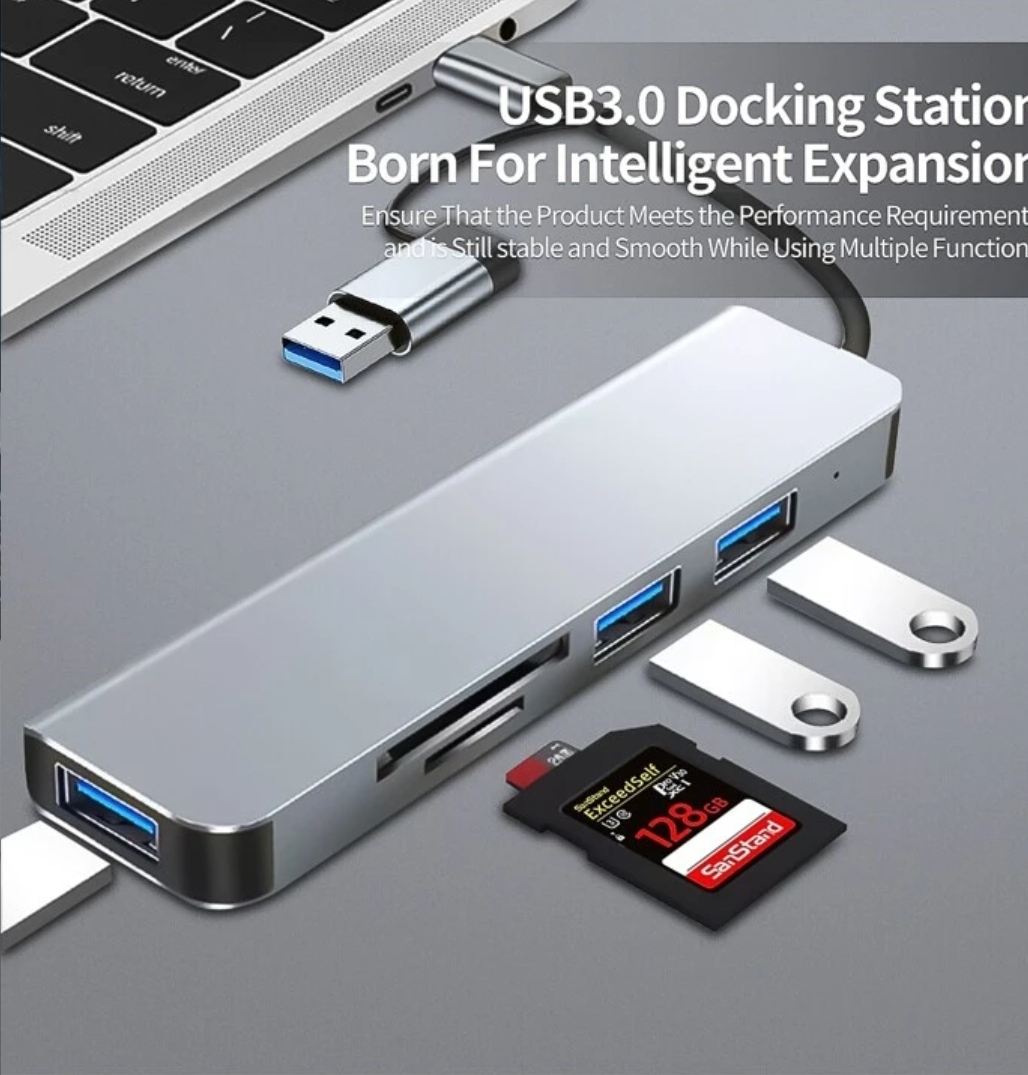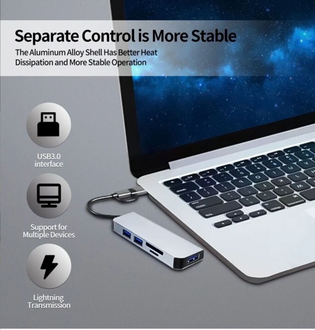 5-Port Docking Station USB C Splitter Hub/Adapter : 1xUSB 3.0 Port, 2xUSB 2.0 Port, 1xMicro SD card reader, 1xTF card reader