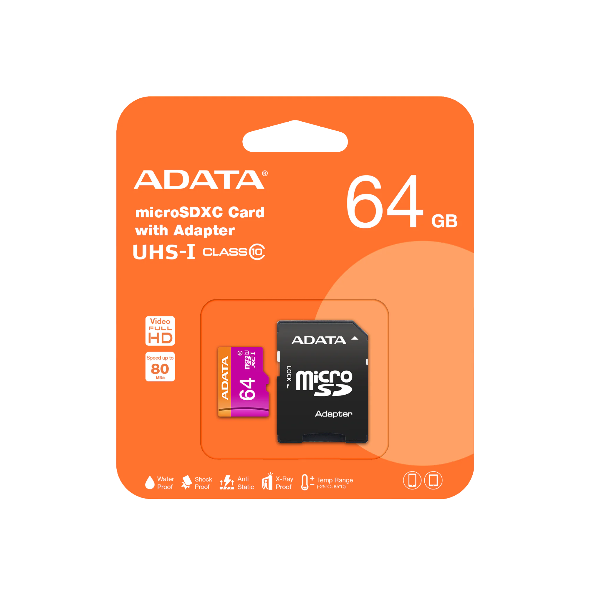 ADATA 64GB microSDXC Card – UHS-I Class 10, 80MB/s Read, FHD Video Support, Durable, With SD Adapter