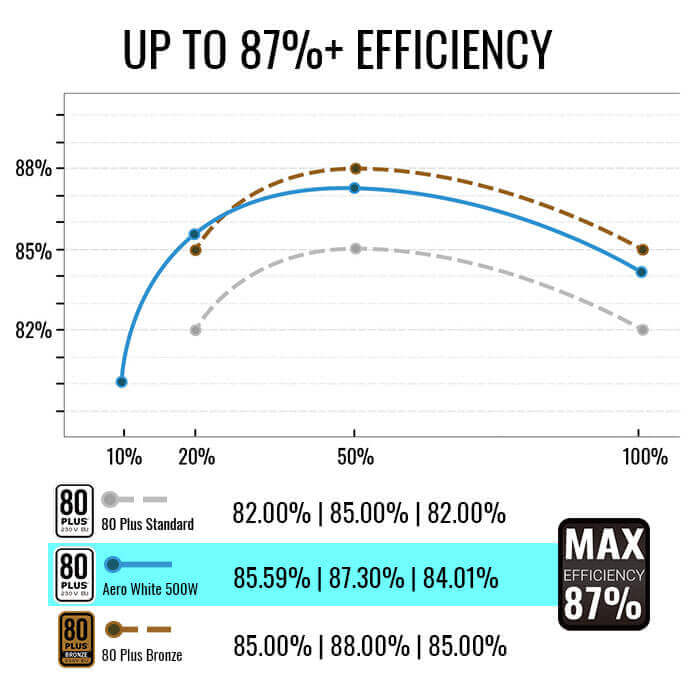The AERO WHITE is 80Plus White 230V EU Certified for up to 87%+ efficiency, rivaling the efficiency performance of 80Plus Bronze 230V EU PSUs.
