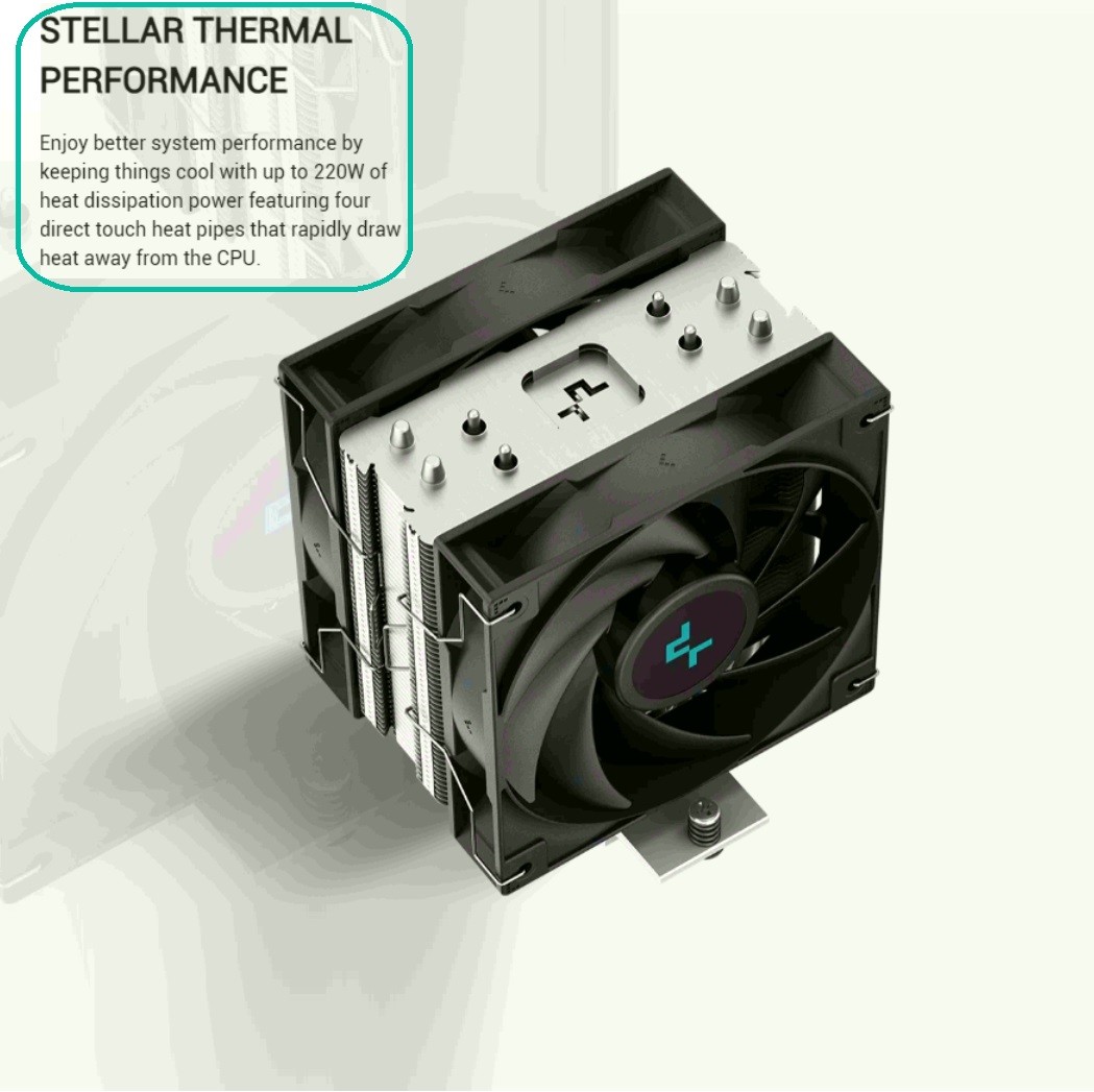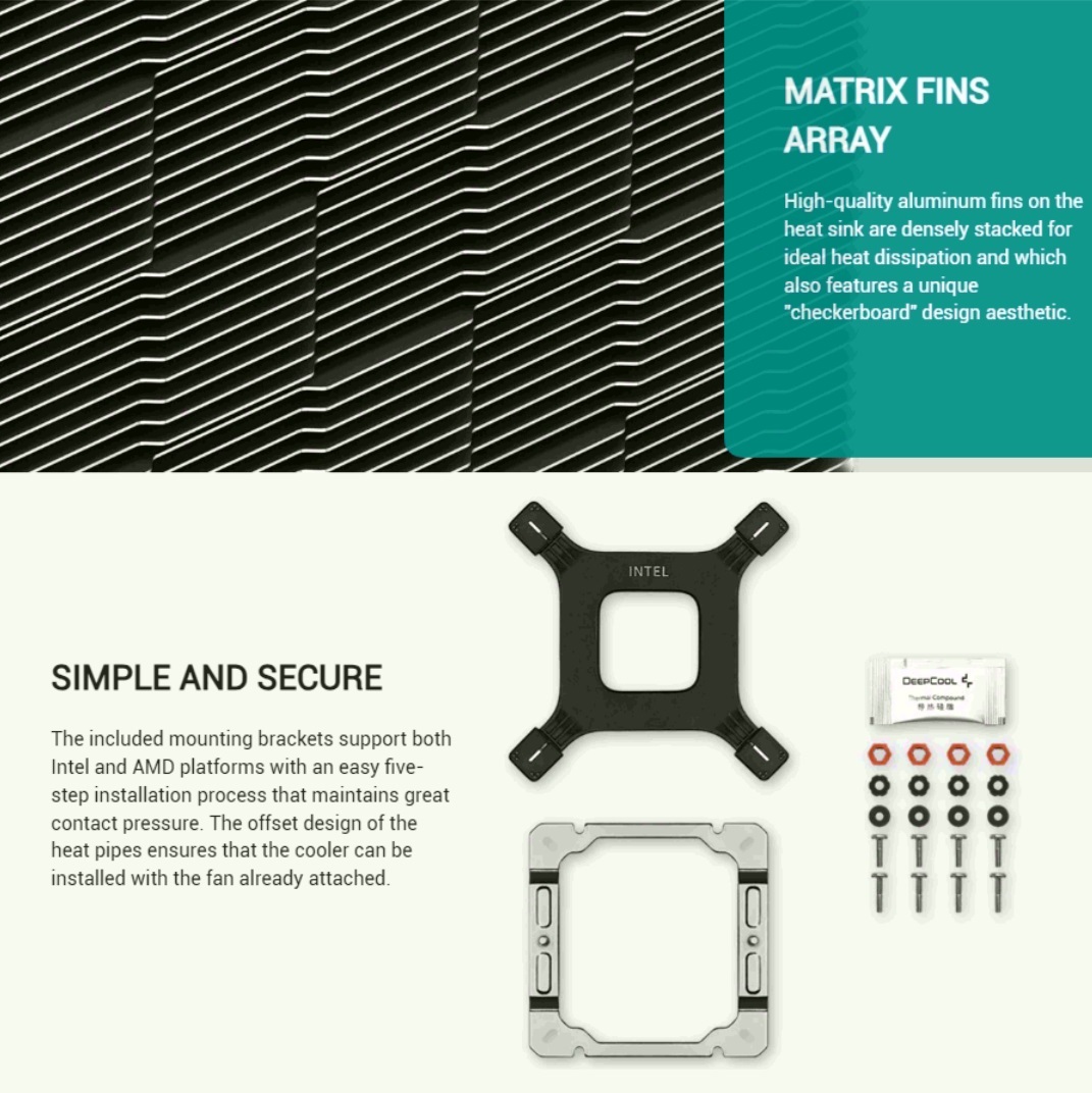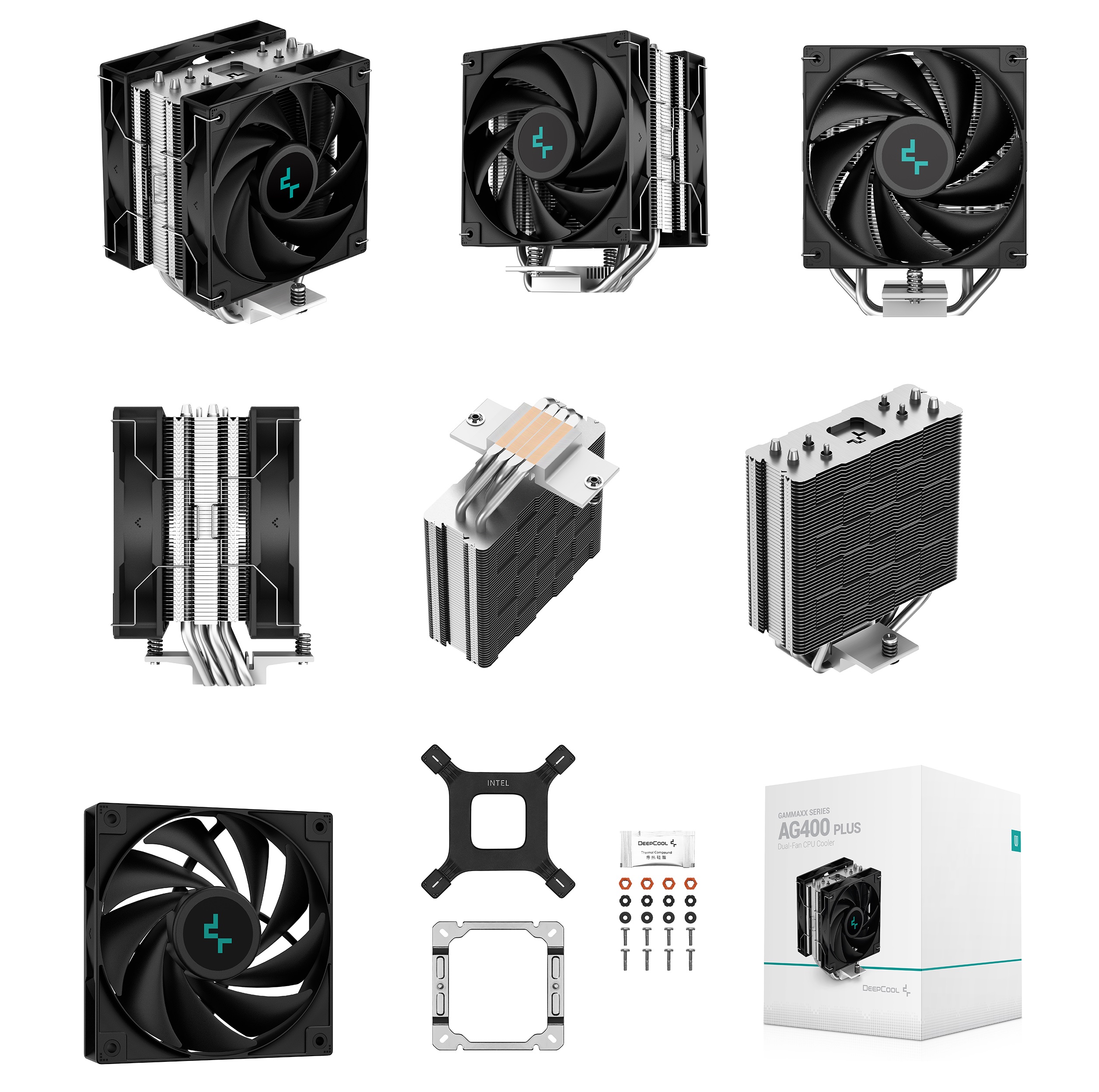 DeepCool AG400 PLUS ; Single Tower 120mm CPU Cooler ; up to 220W of Heat Dissipation ; 4 Direct Touch Heat Pipes ; High Efficiency Silent PWM Fans 500-2000 RPM 75.89 CFM ; Aluminum Matrix Fins Array with Checkerboard Design | Silver & Black
