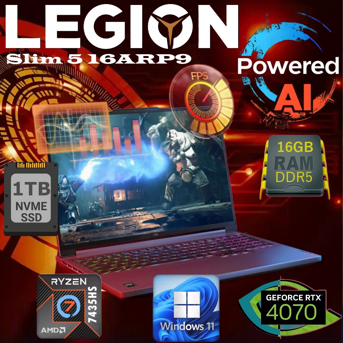 LENOVO AI PC Legion Slim 5 16ARP9 AMD Ryzen™ 7 7435HS | 16GB DDR5 RAM ; 1TB SSD NVMe® | RTX™ 4070 8GB | 16″ WQXGA IPS Display 165Hz | Windows® 11 | 4-Zone RGB Backlit Keyboard | Luna Grey