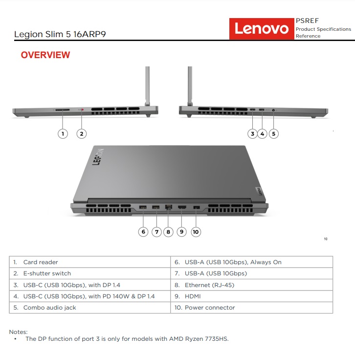 - 1x USB-C® (USB 10Gbps / USB 3.2 Gen 2), with Lenovo® PD 140W and DisplayPort™ 1.4