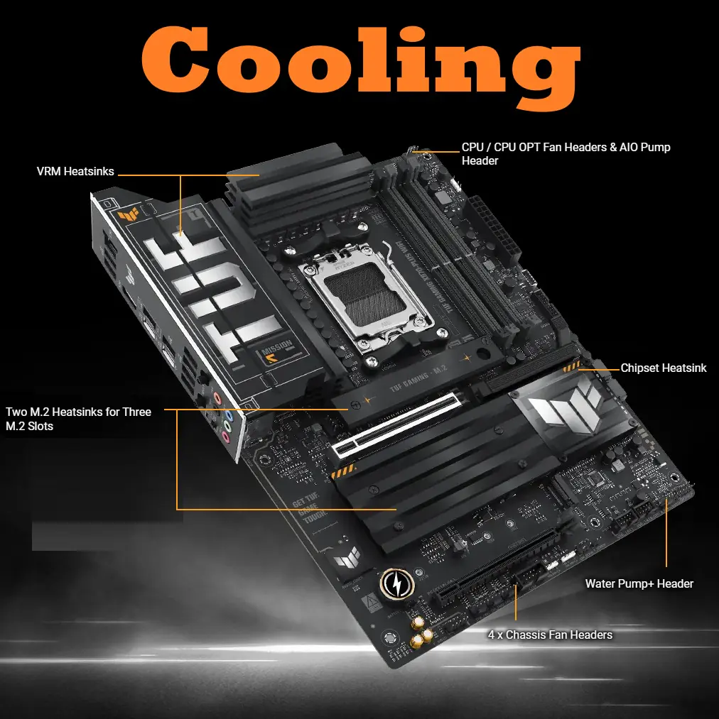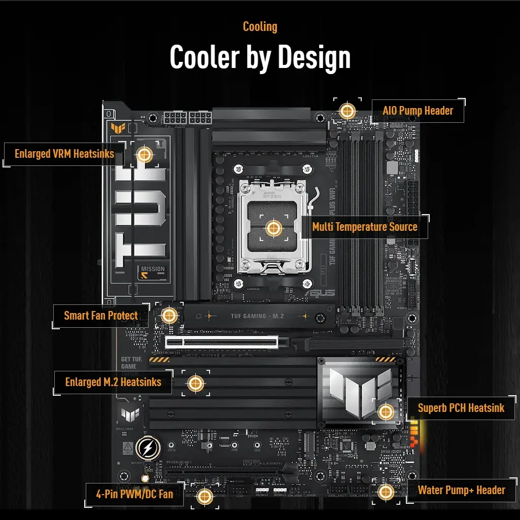 • Latest M.2 Support: Two onboard PCIe 5.0 M.2 slots and two PCIe 4.0 M.2 slots, with massive M.2 heatsinks