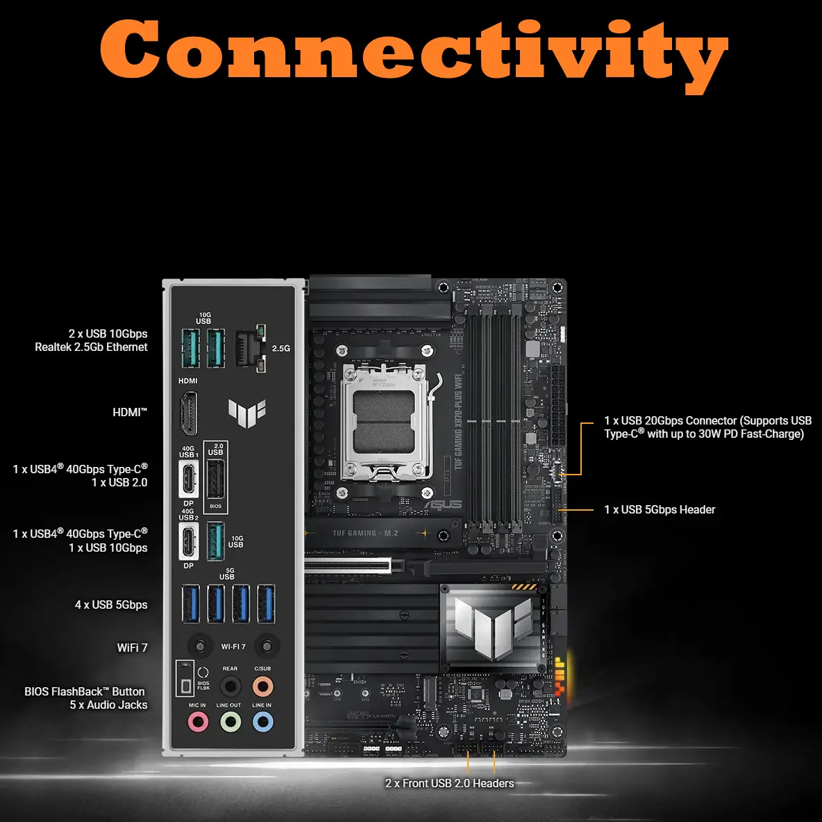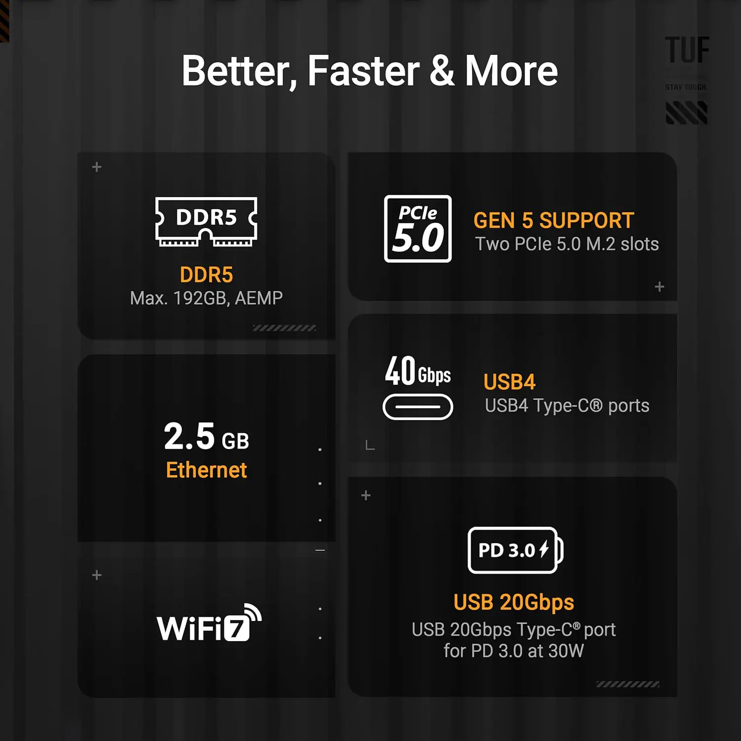 • Ultrafast Connectivity: Wi-Fi 7, PCIe 5.0 x16 slot, Realtek 2.5Gb Ethernet, dual USB4® (40Gbps) Type-C® ports, front USB 20Gbps Type-C® with PD Fast Charge Support