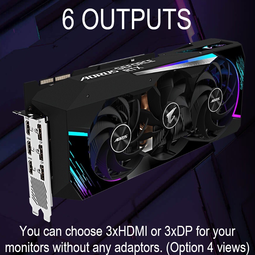 - 6 Video Outputs: 3x DisplayPort 1.4a, 2x HDMI 2.1, 1x HDMI 2.0 for multi-monitor setups.
