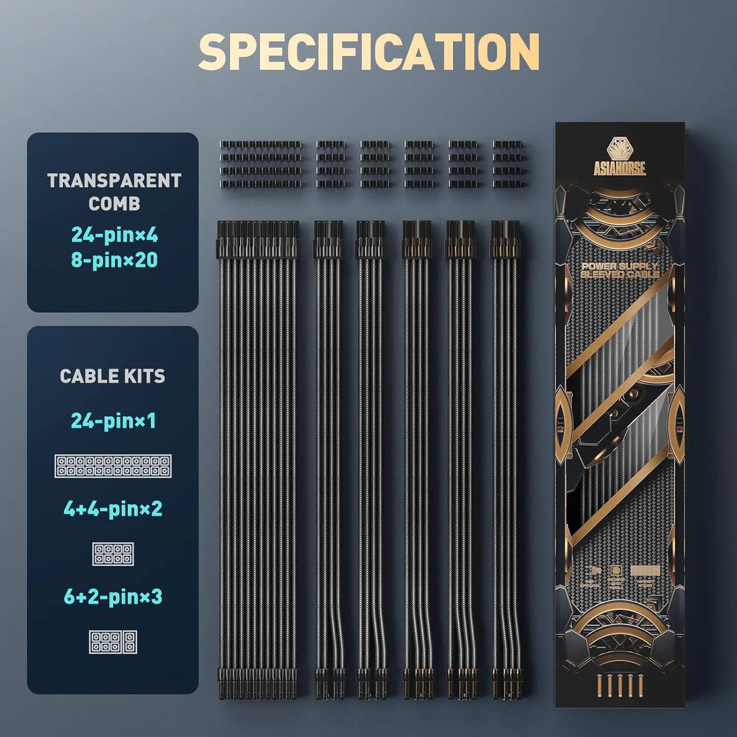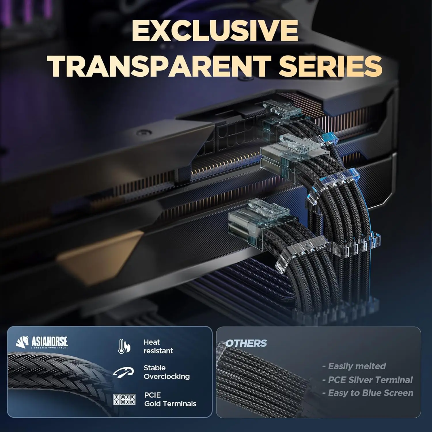 Asiahorse 16AWG Transparent Sleeved PSU Extension Cable Kit – 6-Pack, 300mm, PET Braided, Gold-Plated Terminals, Soft Material, Dual CPU Support, Black
