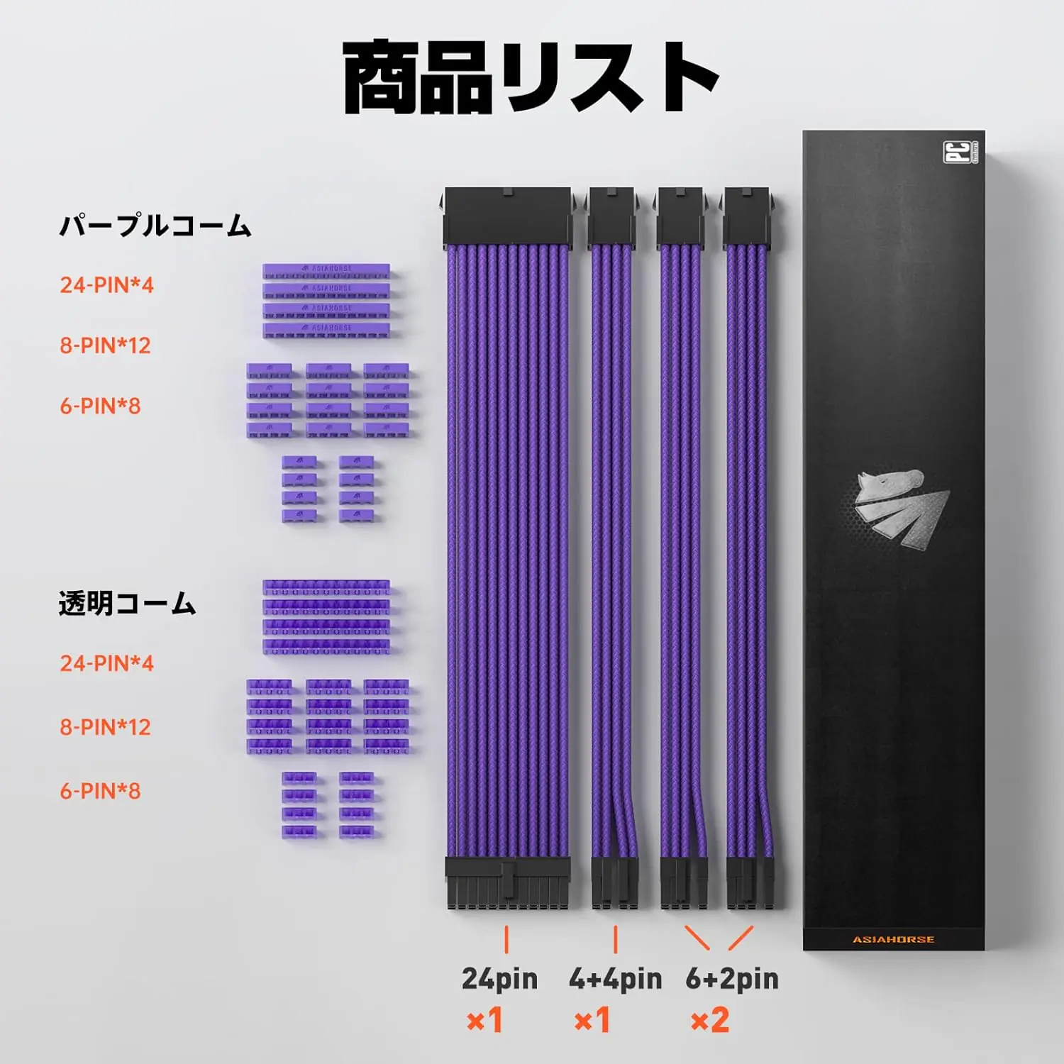 ASIAHORSE 18AWG Purple PSU Cable Extension Kit – 4 Pack (24-Pin ATX, 4+4 Pin EPS, 2x PCI-E 6+2) Braided Sleeved, Soft Nylon, Cable Combs, Universal Compatibility