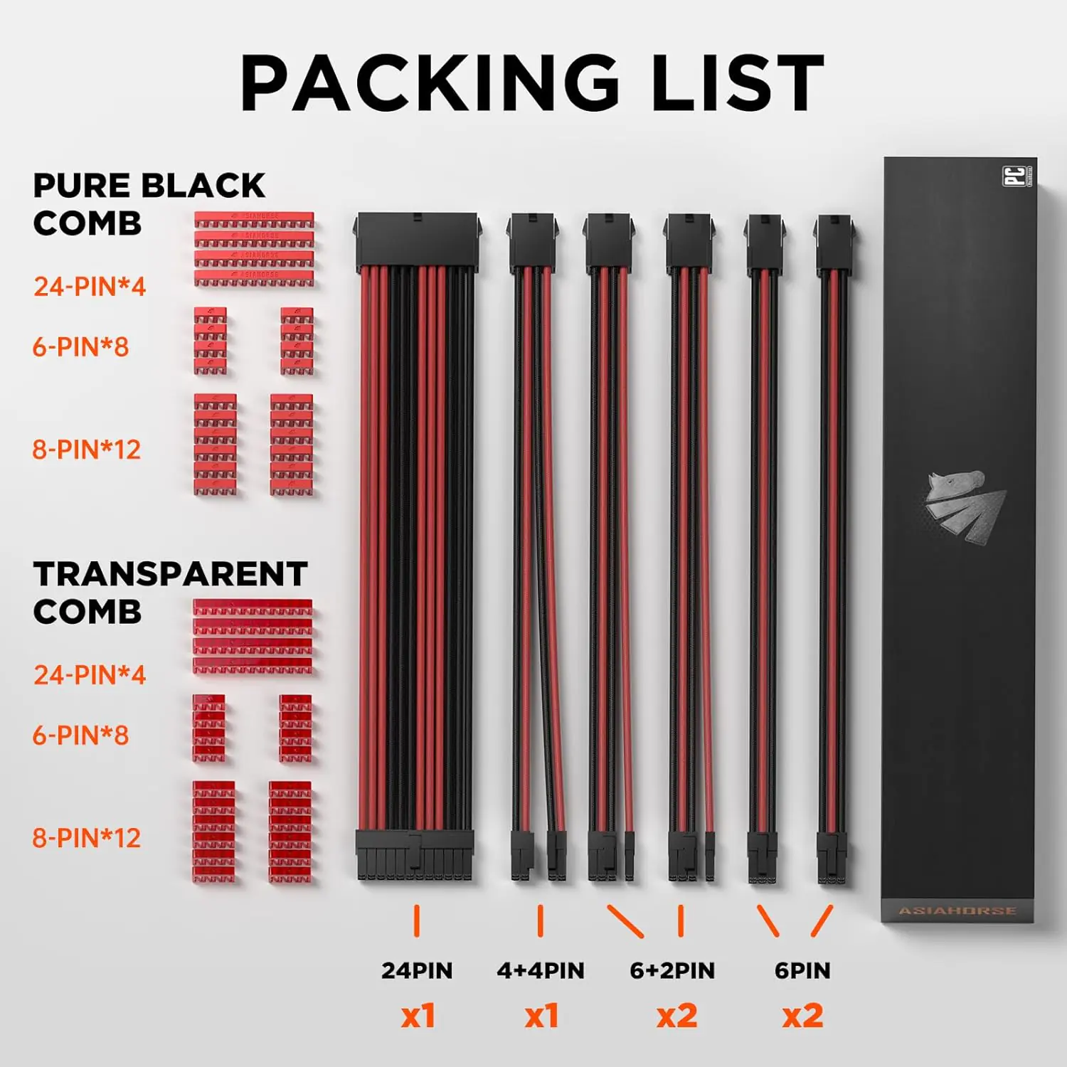 AsiaHorse 18AWG Red-Black Sleeved PSU Extension Cable Kit – 6 Pack, 300mm, PET Braided, Phosphor Copper Terminals, Durable & Flexible Cable Management Solution