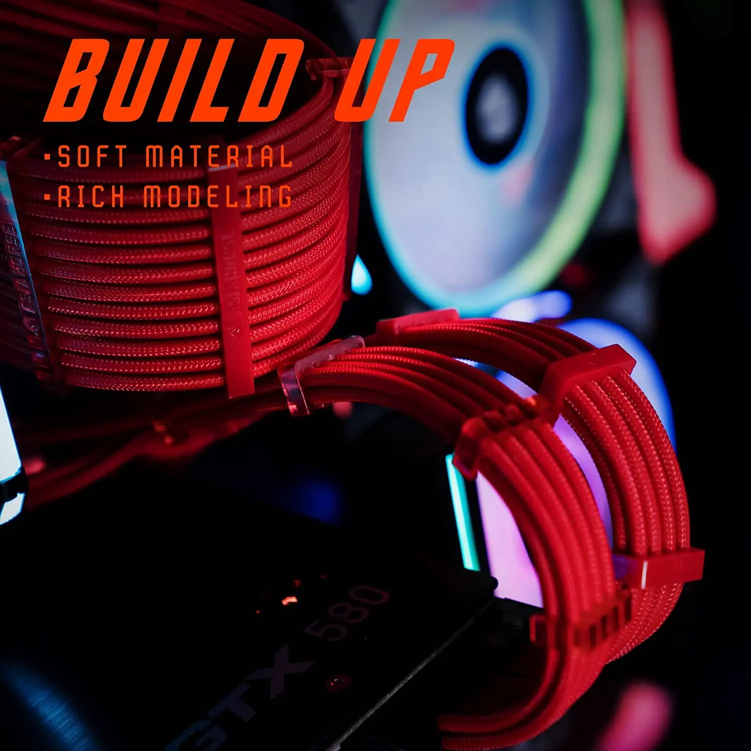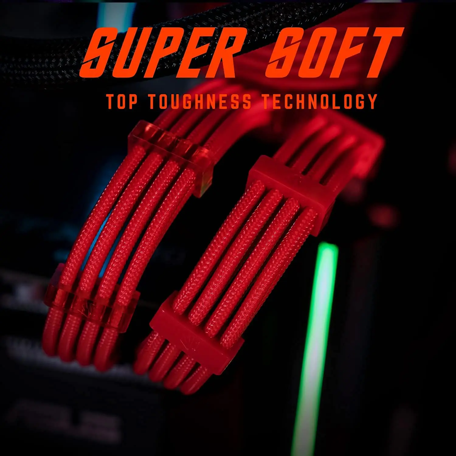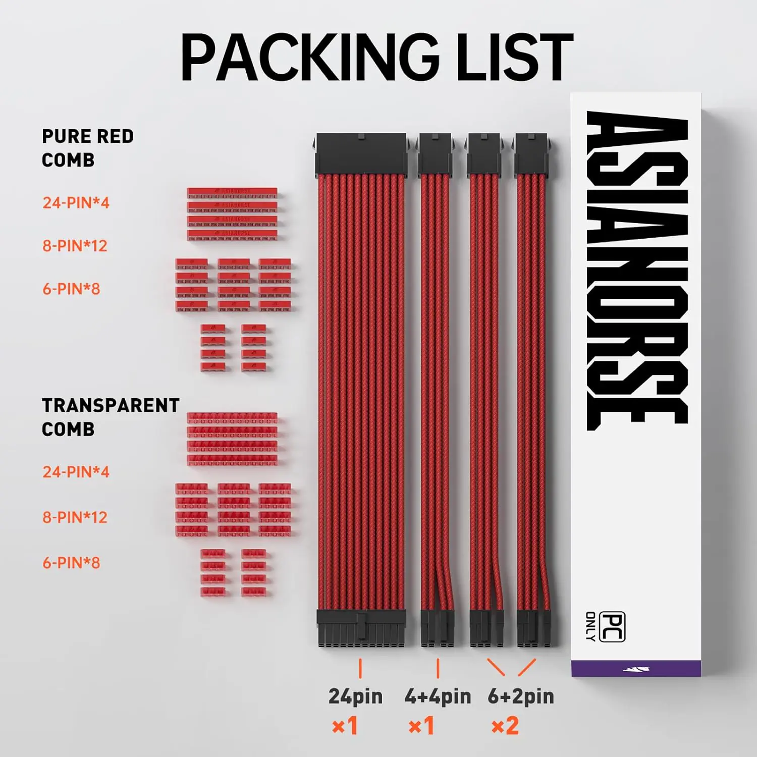ASIAHORSE 18AWG Red PSU Cable Extension Kit – 4 Pack (24-Pin ATX, 4+4 Pin EPS, 2x PCI-E 6+2) Braided Sleeved, Soft Nylon, Cable Combs, Universal Compatibility