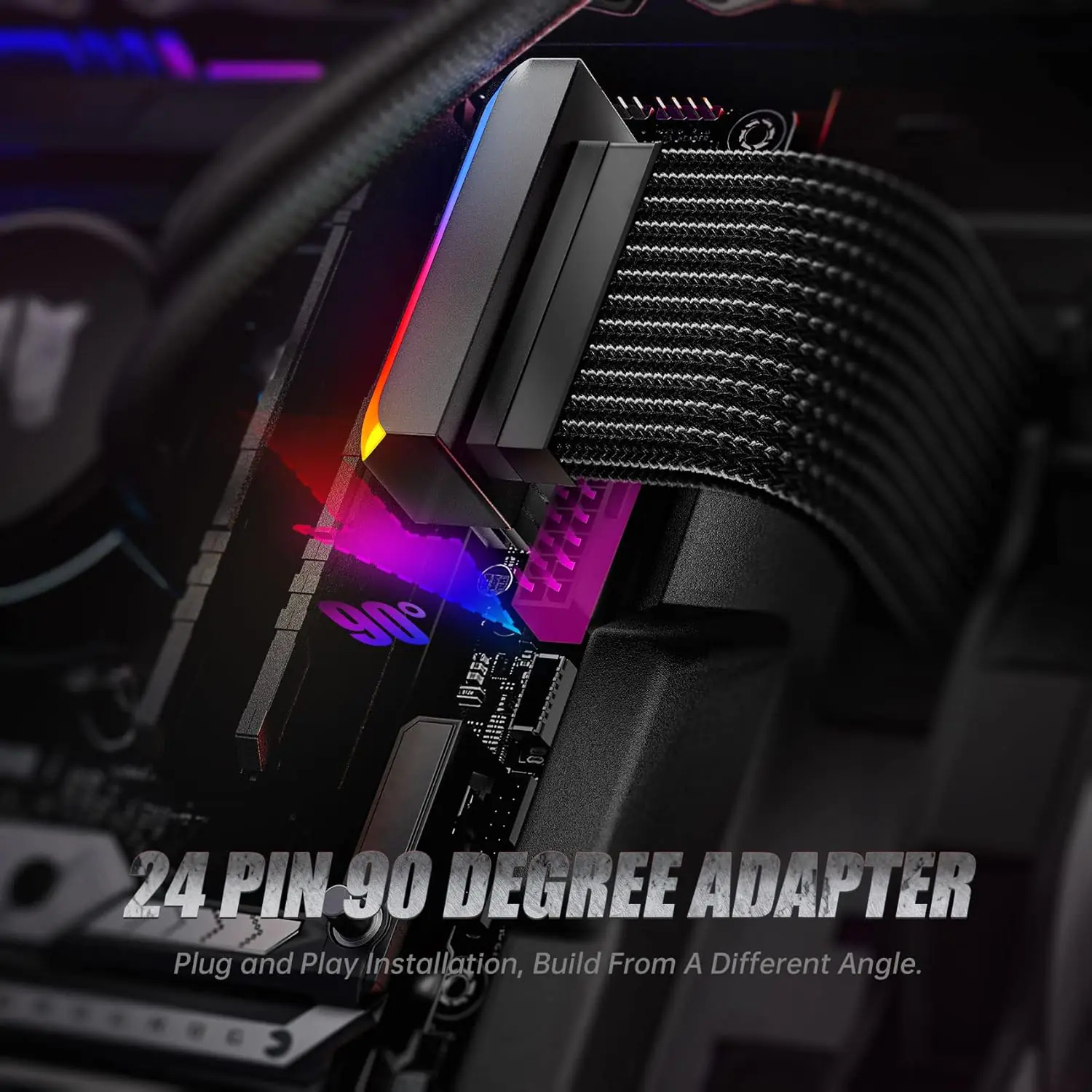 AsiaHorse 24 Pin 90° ATX Adapter with ARGB Lighting | Easy Cable Management, 5V 3-Pin Sync, 6 Addressable LEDs, Universal ATX Compatibility – Black