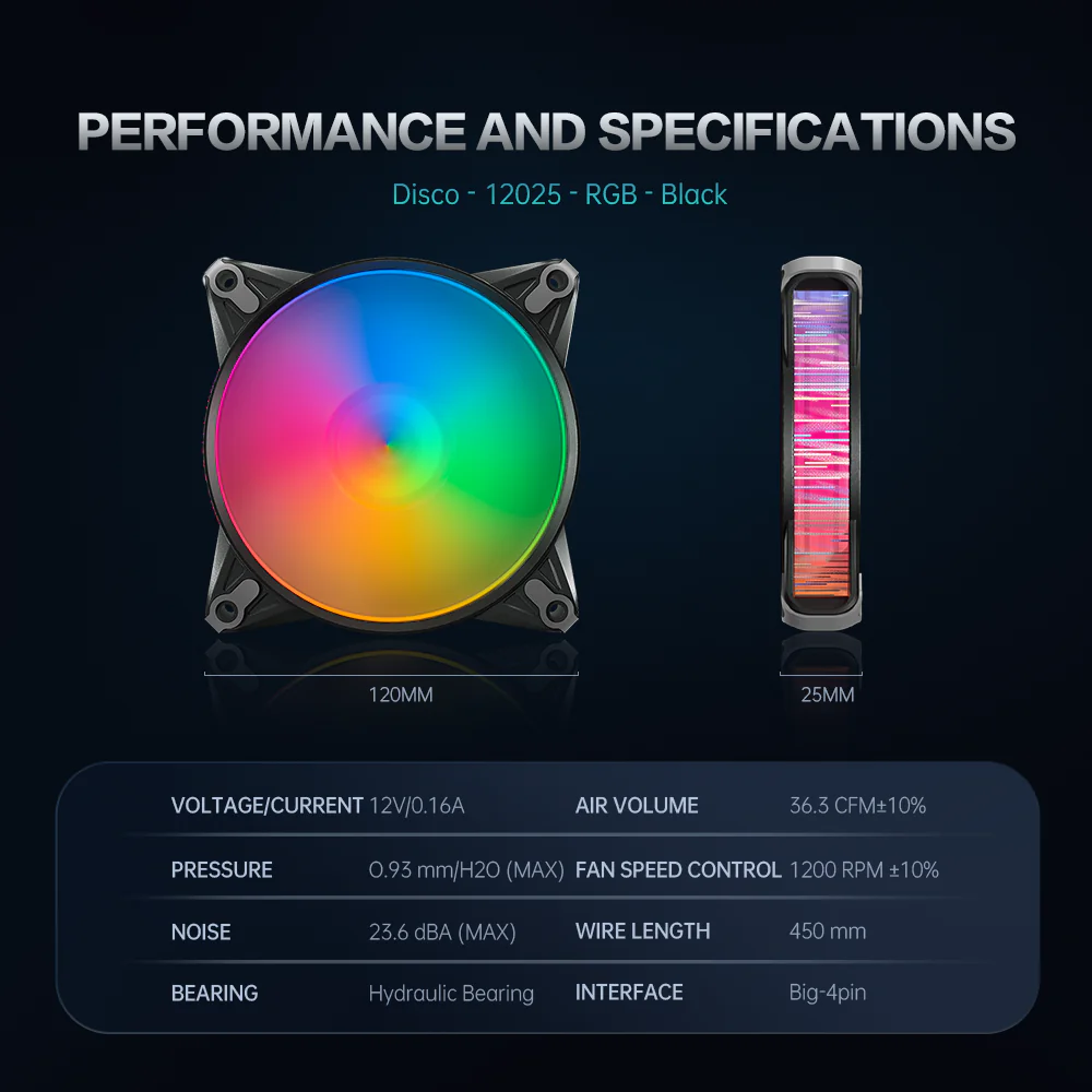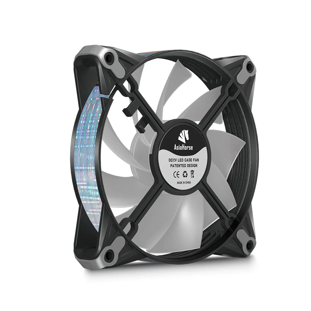 ASIAHORSE DISCO RGB 120mm Fan (1 Pack) – Black, 1200RPM, 36.3CFM Airflow, 4-Pin Connector, Hydraulic Bearing, Low Noise 23.6dBA, 450mm Cable