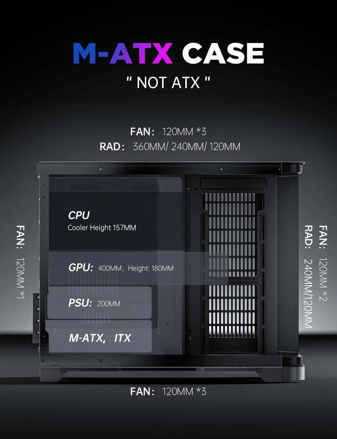 - Spacious Interior for Custom Builds: 50% larger than standard Micro-ATX cases, offering ample space for advanced setups, efficient cable management, and decorative customizations.