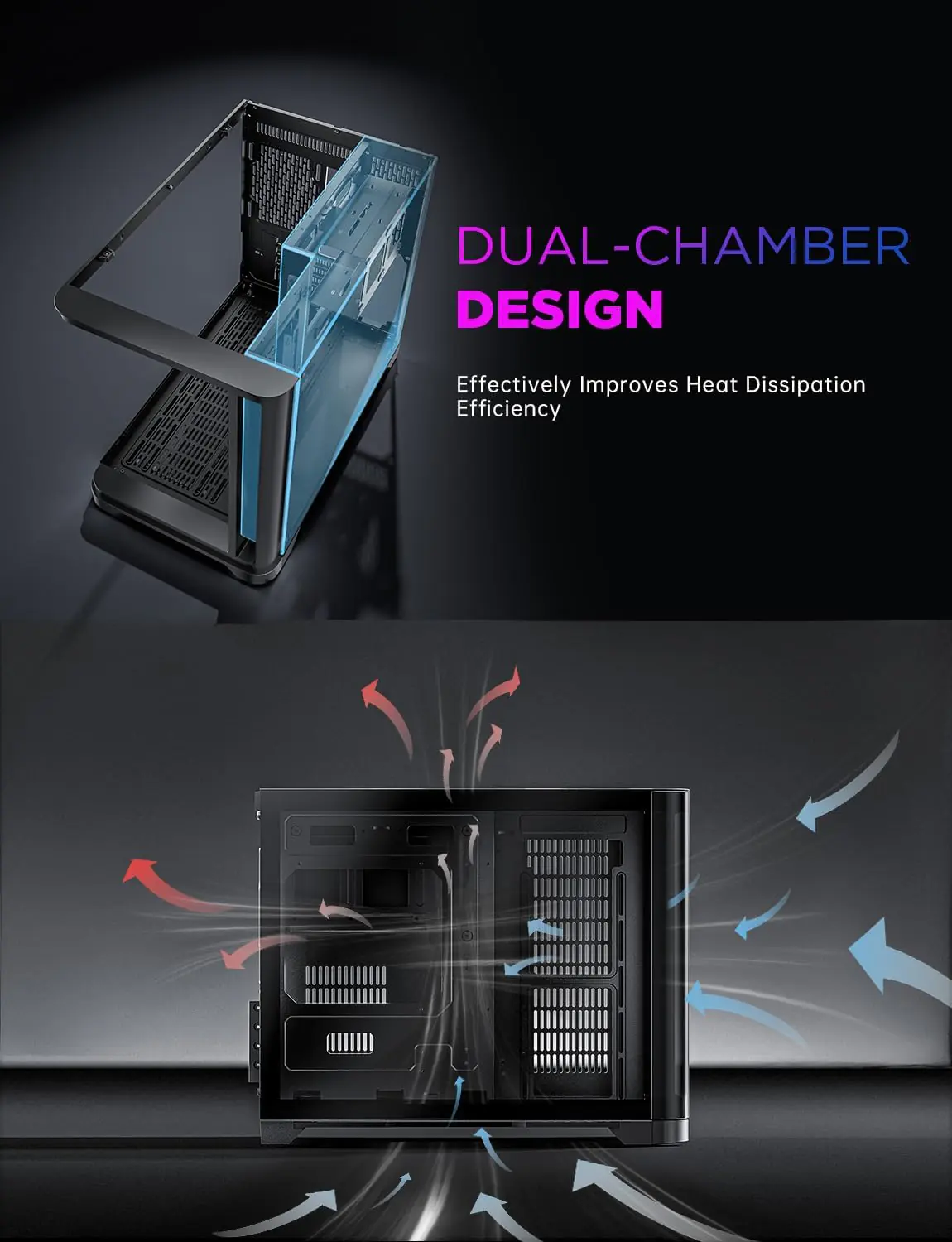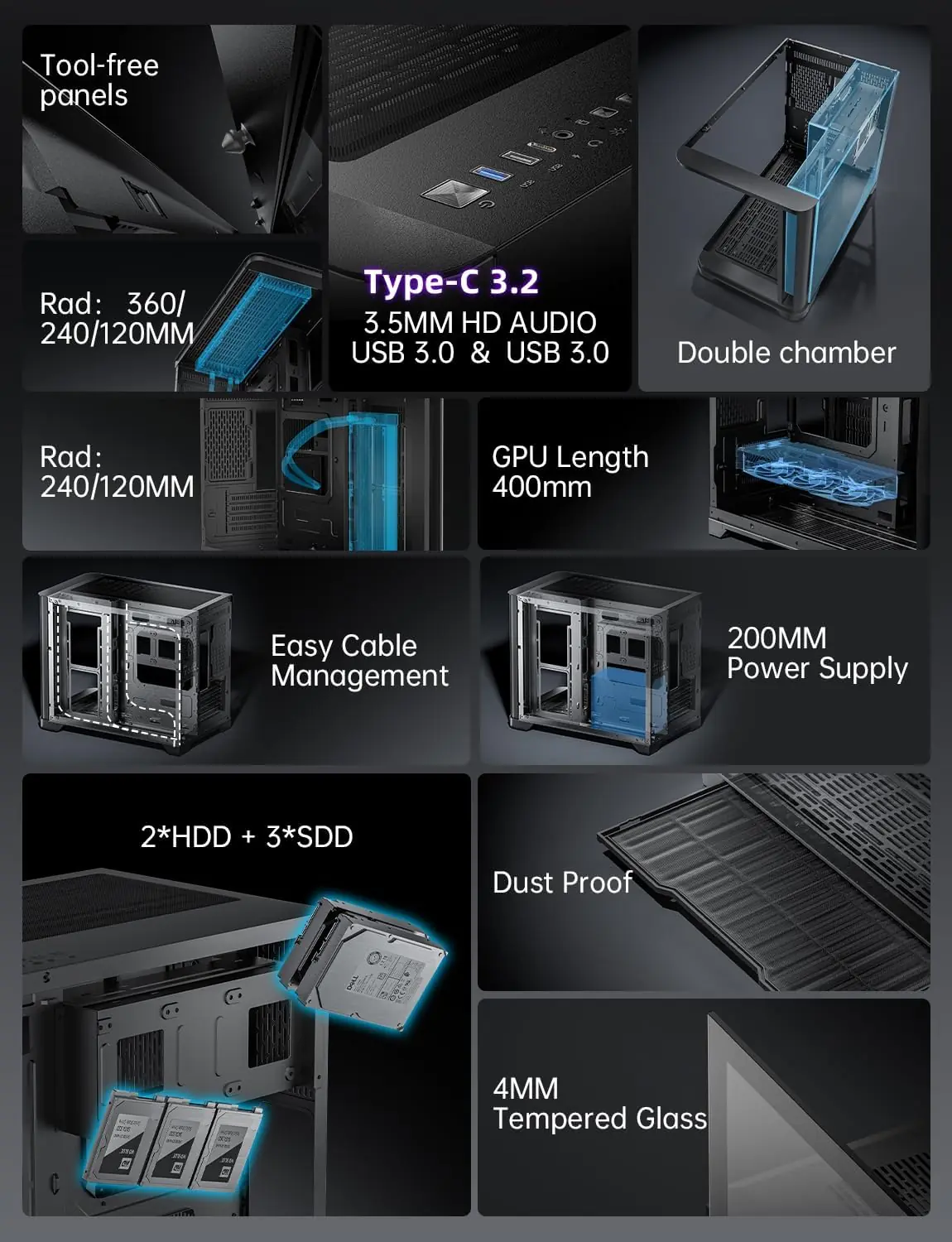 - Optimized Airflow & Cooling: built with 9 fan mounting positions and support for up to 360mm water cooling on top and bottom, plus 240mm on the side for ultimate thermal performance.