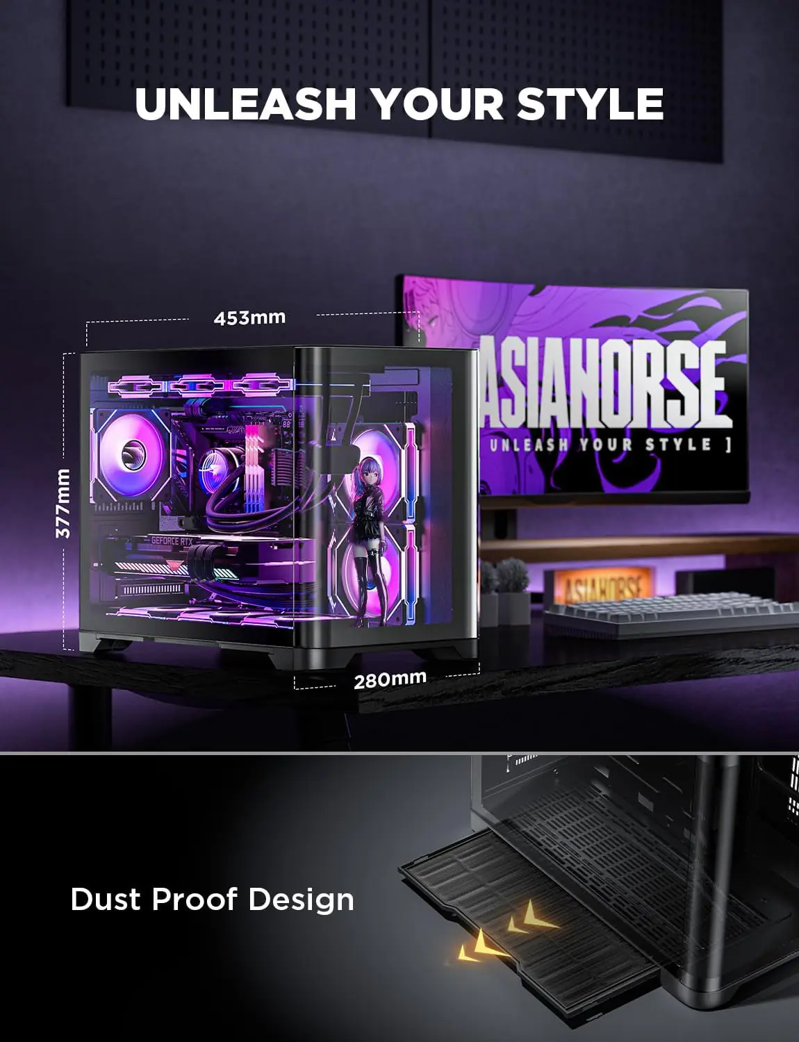 ASIAHORSE Perseus Mid Tower ATX Case – Dual-Chamber Design, Panoramic Curved Glass, Type-C I/O, 360mm Water Cooling Support, 9 Fan Slots, Robust SPCC Steel Frame, Black