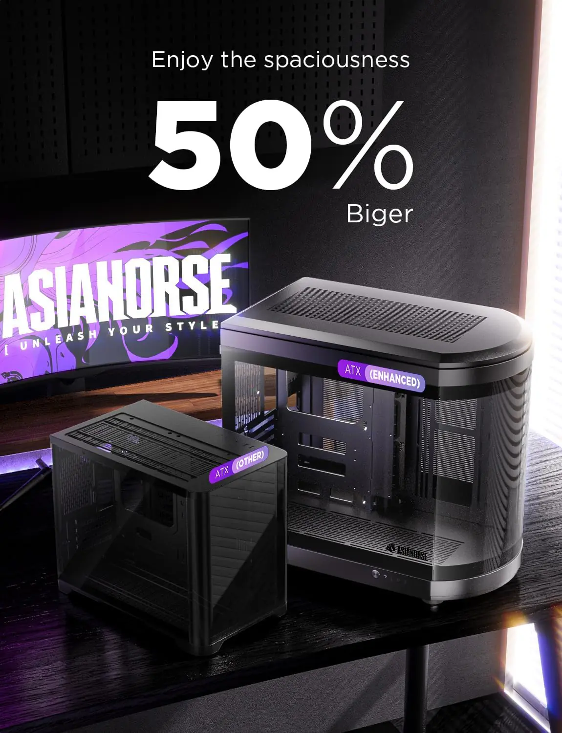 ASIAHORSE Perseus Mid Tower ATX Case – Dual-Chamber Design, Panoramic Curved Glass, Type-C I/O, 360mm Water Cooling Support, 9 Fan Slots, Robust SPCC Steel Frame, Black