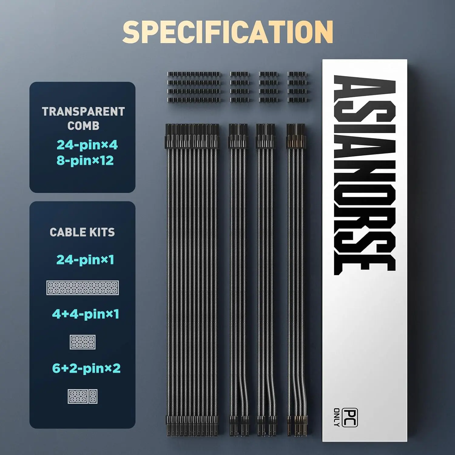 ASIAHORSE Transparent Sleeved PSU Extension Cable 4 Kit – 16AWG UL1007 Wires, 24-Pin ATX, PCIe 6+2, CPU 4+4, PET Braided, 30cm Length, Gold-Plated Terminals – Black