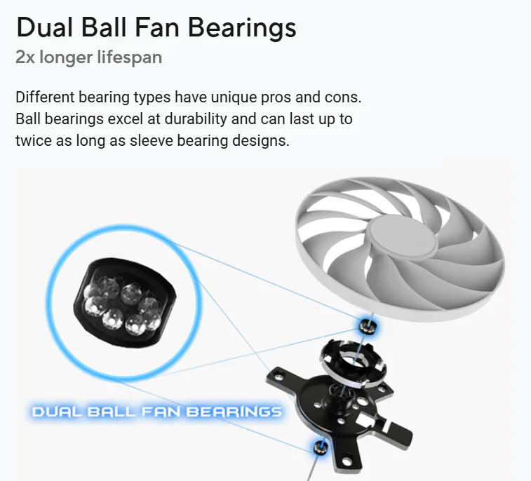 - Silent & Durable – 0dB tech keeps light gaming quiet; dual ball bearings last twice as long as sleeve bearings.