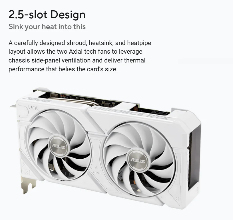 - Dual Axial-Tech Fans – Smaller hub, longer blades, and a barrier ring increase downward air pressure for superior cooling in a compact 2.5-slot design.