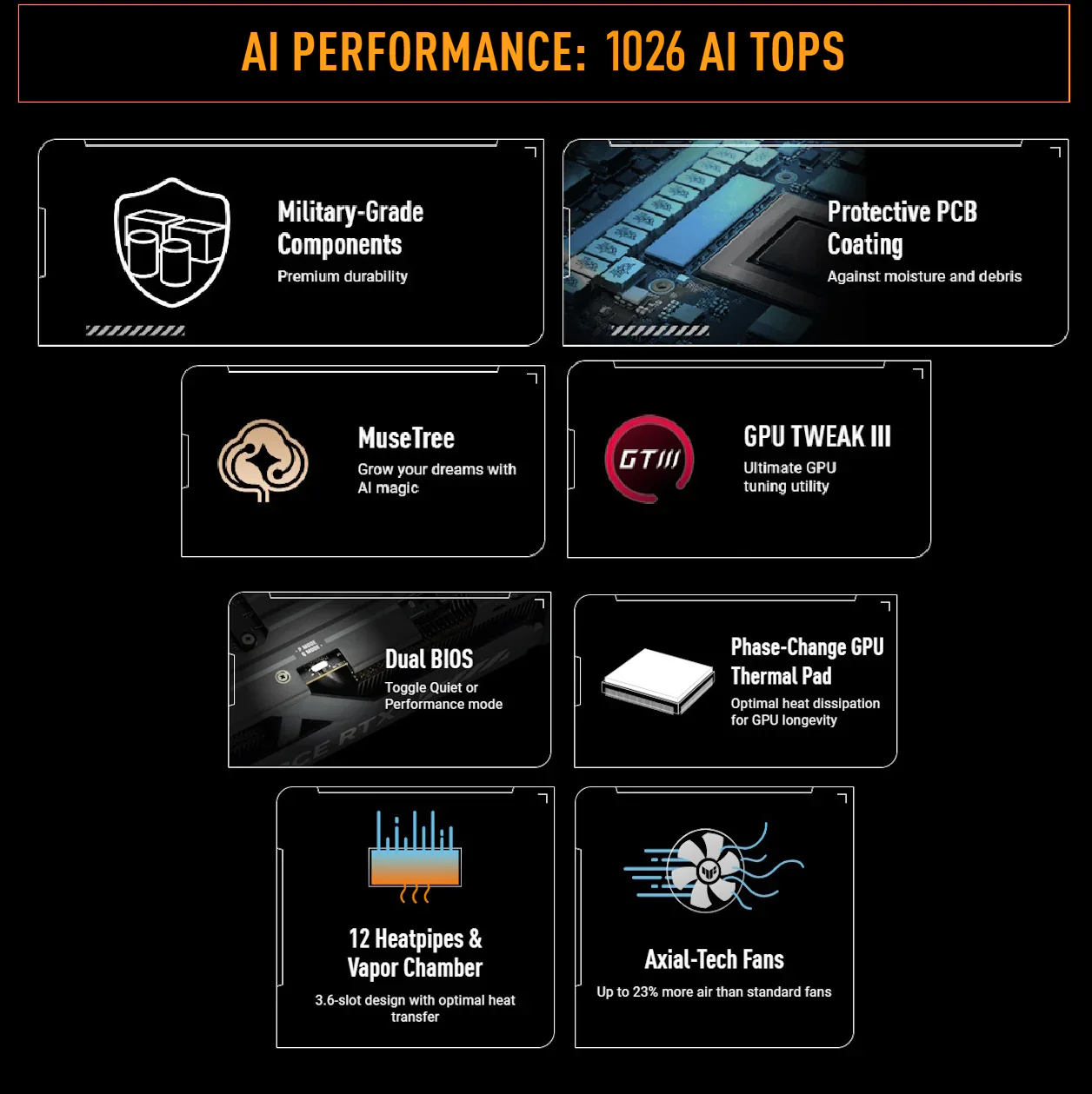 - Software Suite Included : GPU Tweak III, MuseTree AI tools, and access to GeForce Game Ready & Studio Drivers.