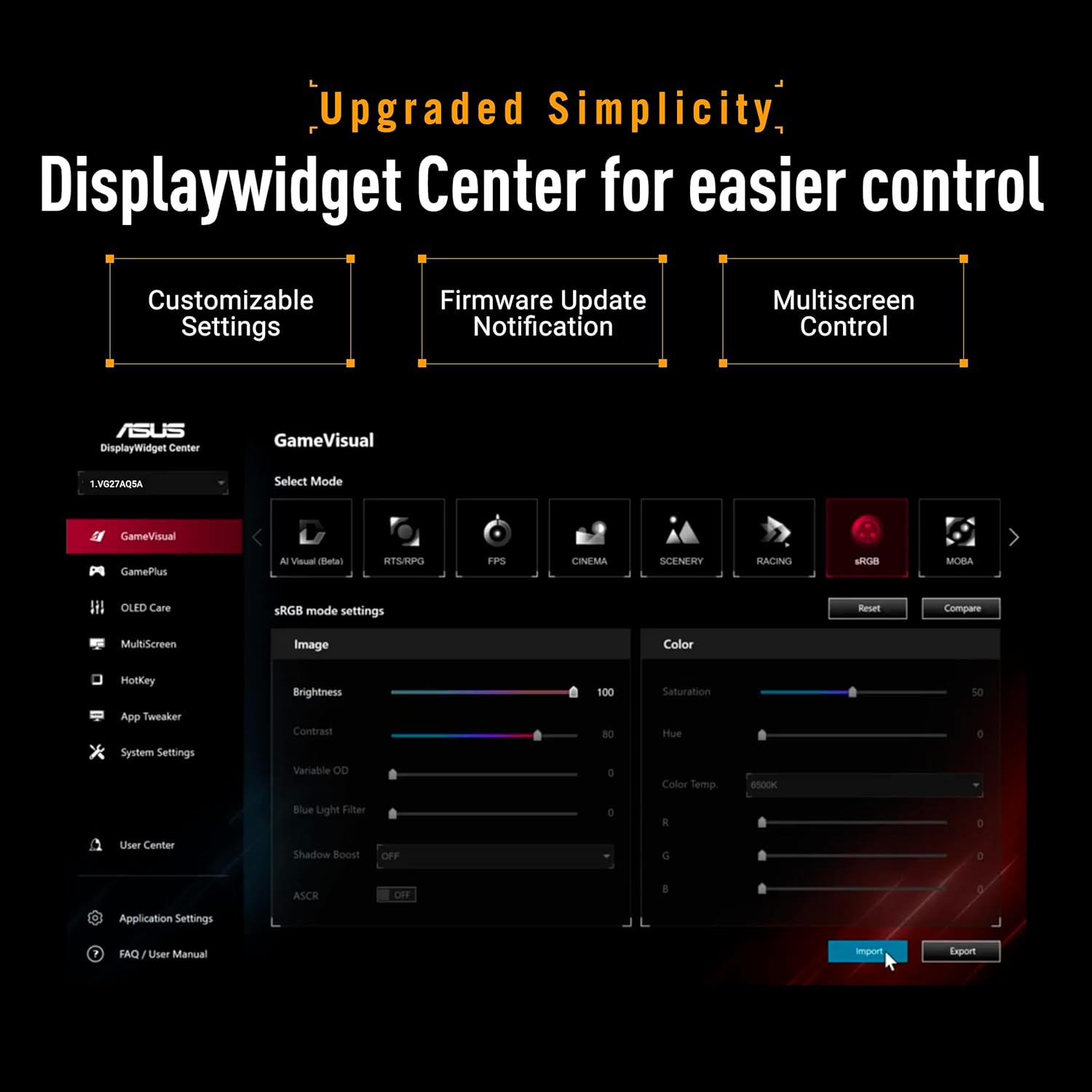 - ASUS DisplayWidget Center: Adjust monitor settings, firmware, and GameVisual modes directly with your mouse — no more button mashing!