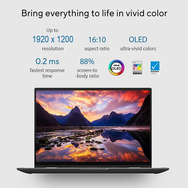 - Display: 14.0-inch FHD (1920 x 1200) OLED, 16:10 aspect ratio, 500 nits HDR, 60Hz, 0.2ms response time. 100% DCI-P3 color gamut, 87% screen-to-body ratio, touch screen with stylus support.