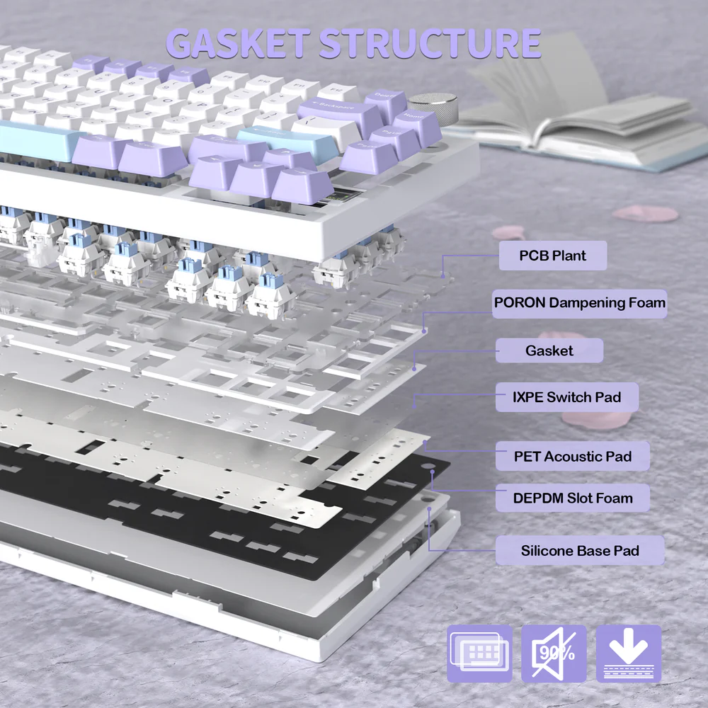 - Advanced 5-Layer Acoustic Tuning : PORON foam, IXPE pad, PET sheet, DEPDM, and molded silicone combine to deepen sound, soften impact, and enhance typing feedback.