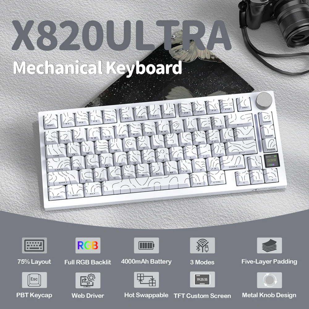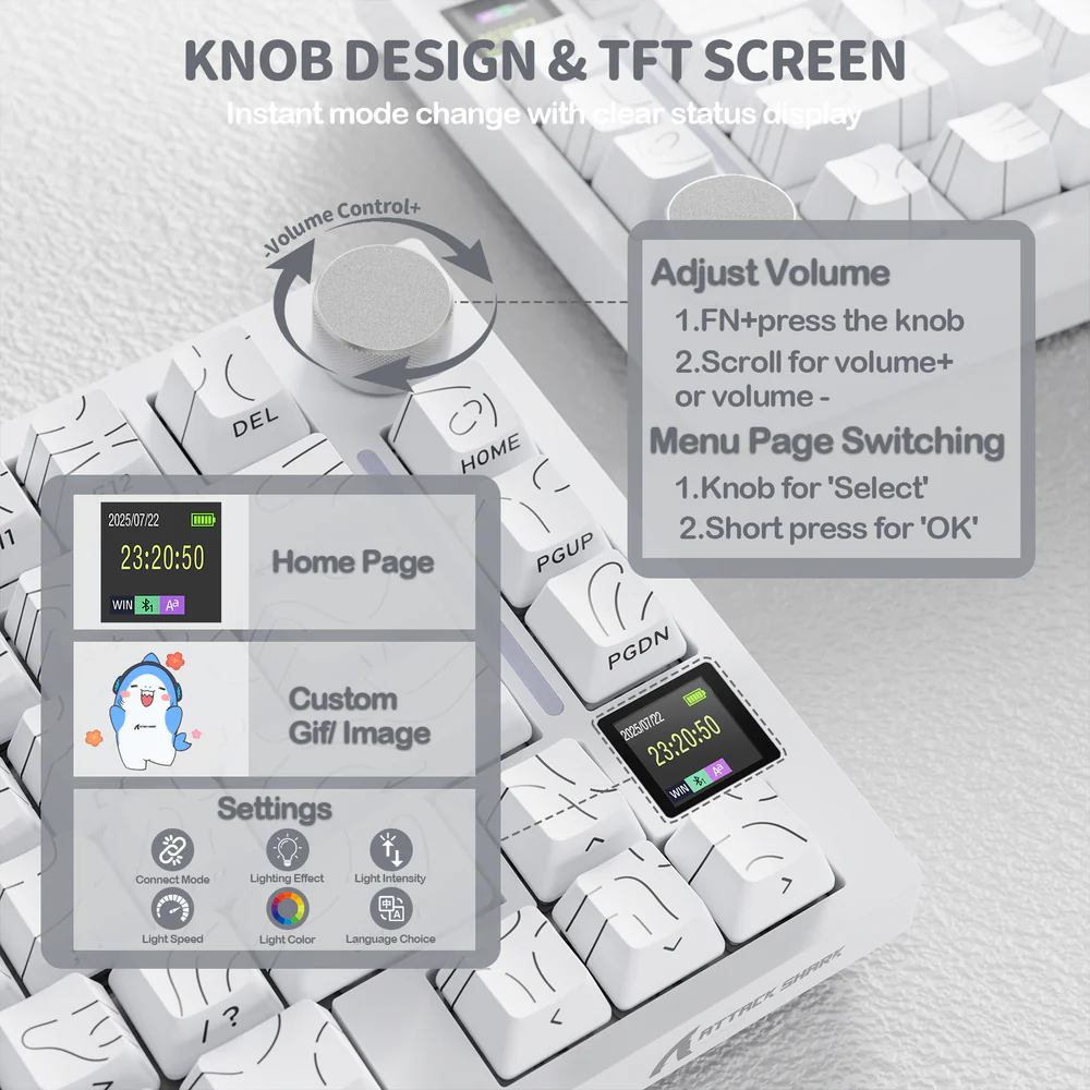 ATTACK SHARK X820 Ultra 75% Tri-Mode Gasket Mechanical Keyboard With Smart TFT Display, Metal Knob, Hot-Swappable Linear “GIFT” Switches, 4000mAh Battery, And RGB Backlight | White Contour