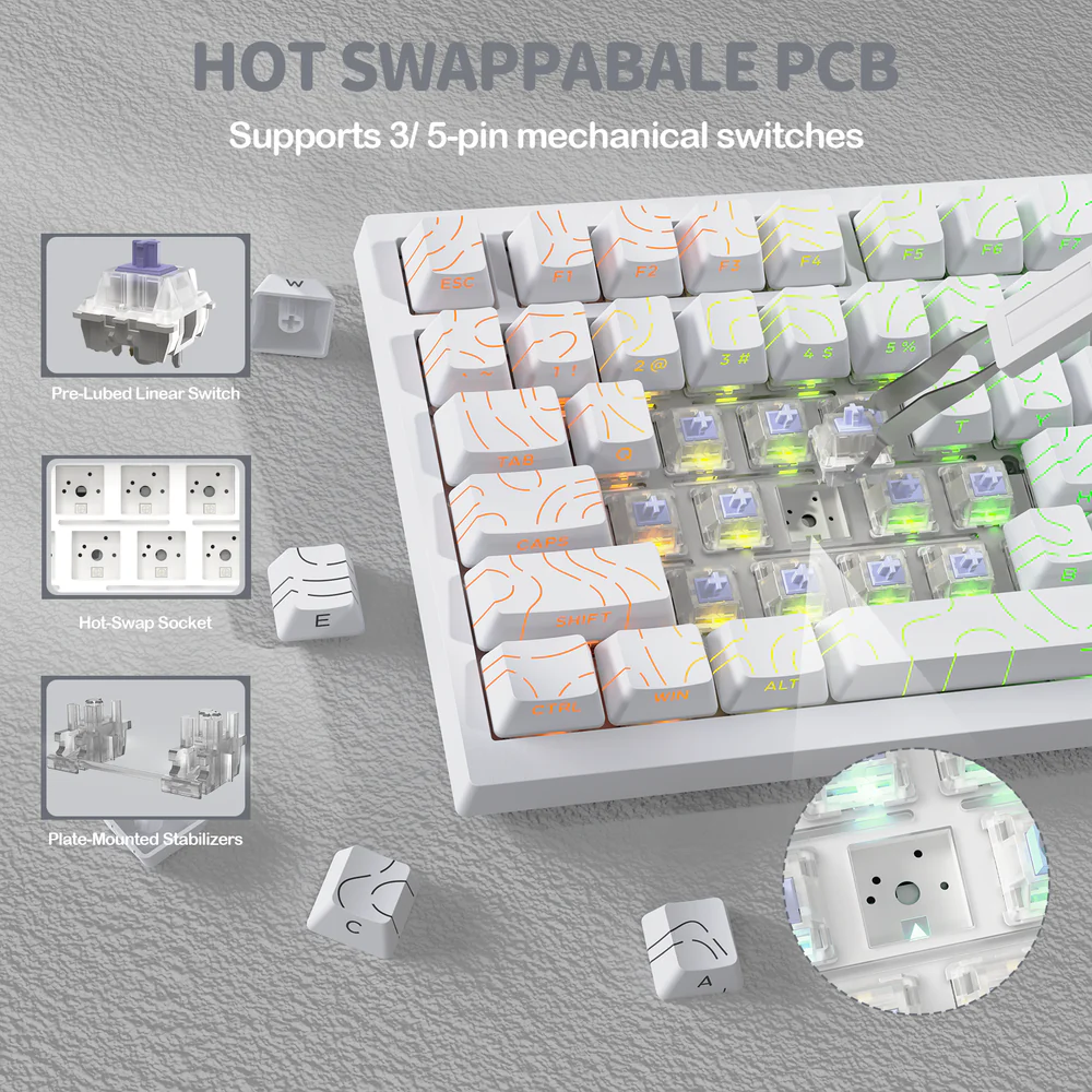 - Hot-Swappable Switch Sockets : Supports both 3-pin and 5-pin mechanical switches, allowing easy customization without soldering.