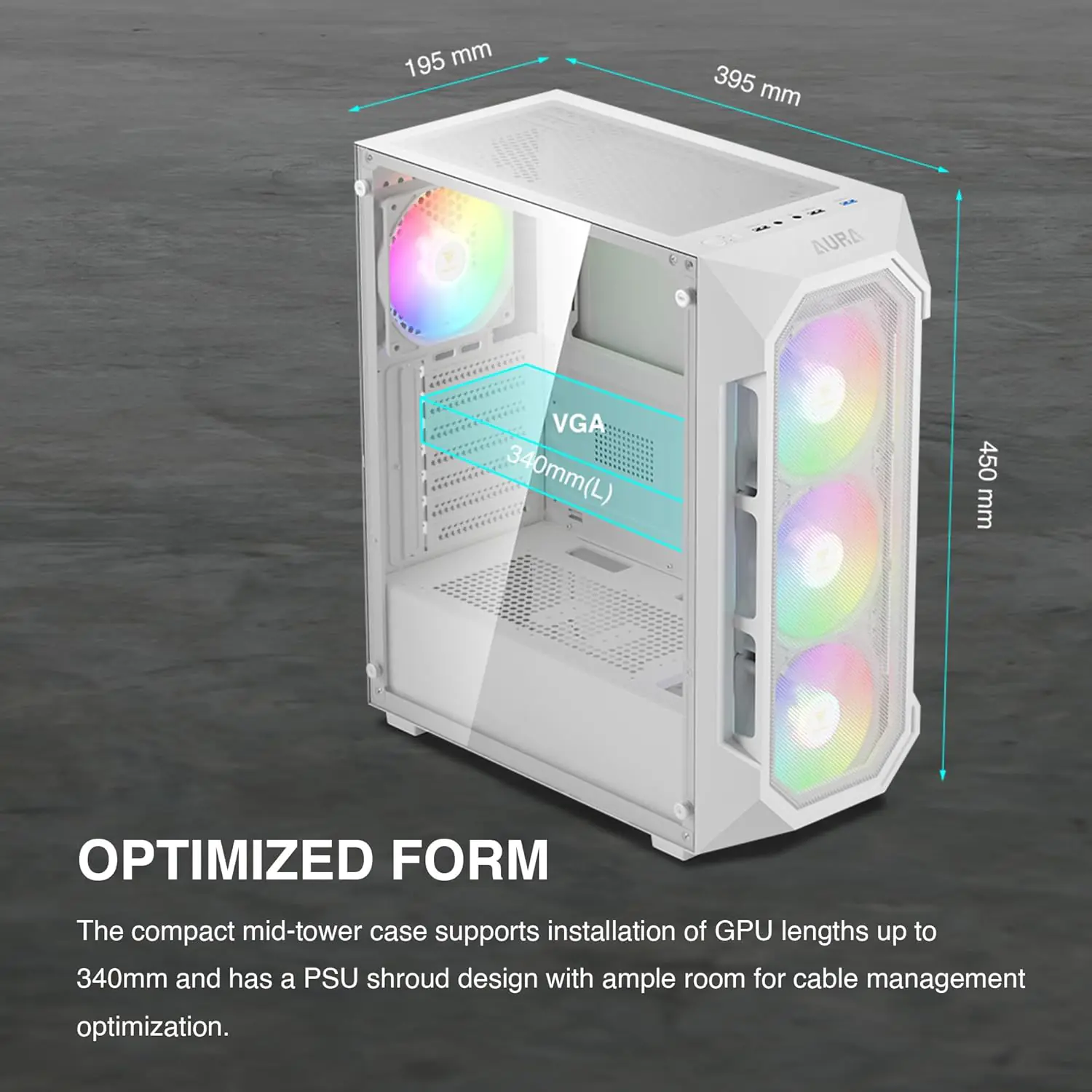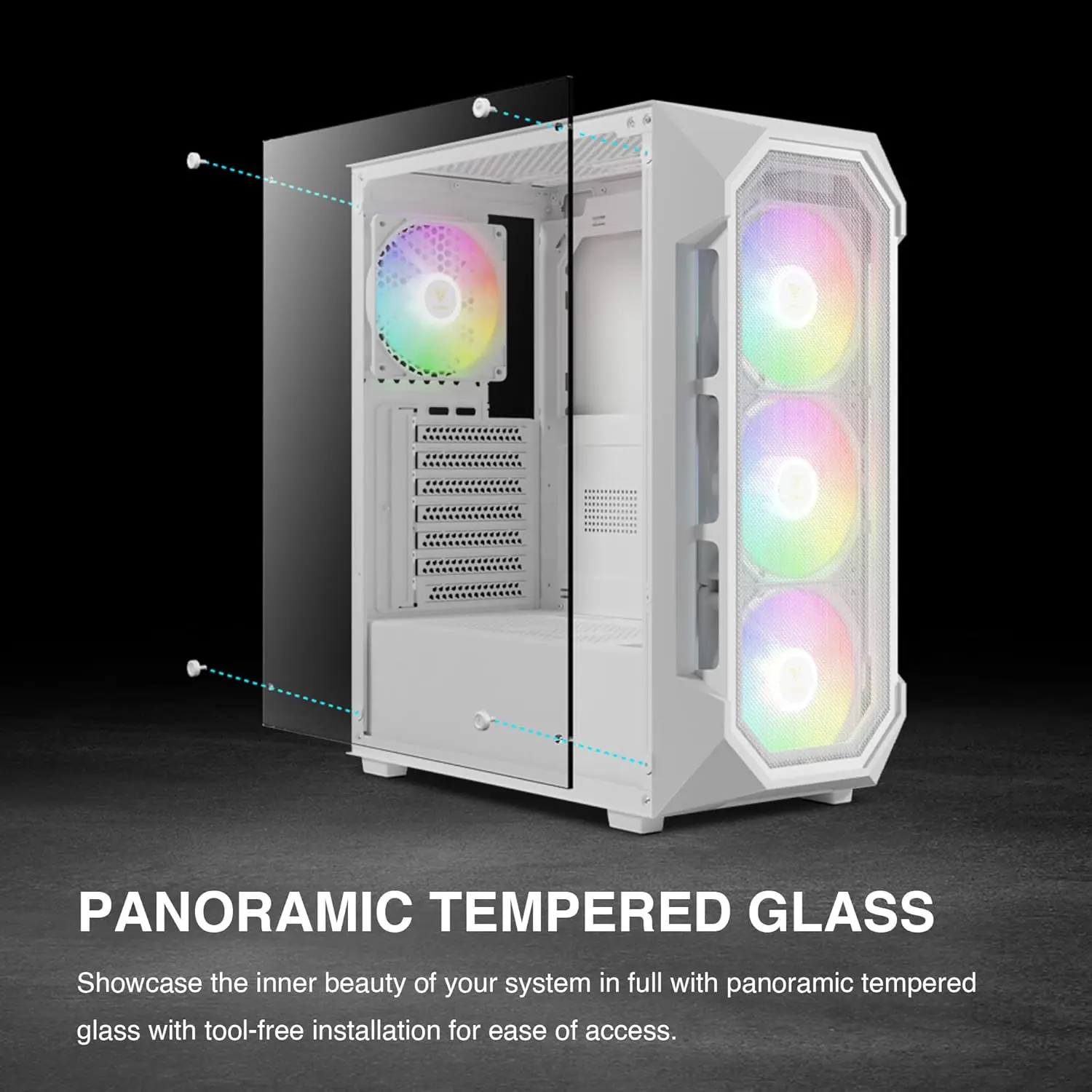 GAMDIAS AURA GC1 ELITE – Mesh ARGB Mid-Tower With 4 Fixed RGB Fans, Tempered Glass, PSU Shroud, ATX Support, 340mm GPU Clearance & 360mm Radiator Compatibility | WHITE