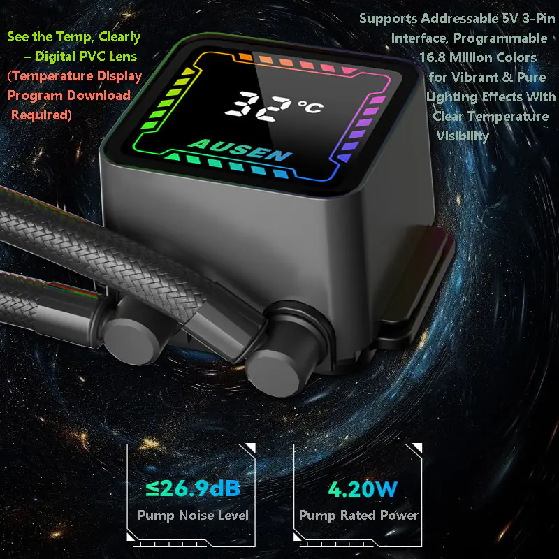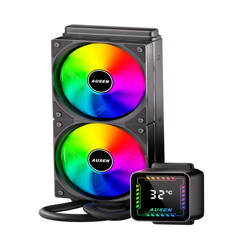 AUSEN GT240 AIO 240mm Liquid CPU Cooler – Dual 120mm ARGB Fans, LCD Display, 250W TDP, Copper & Aluminum Build, Multi-Socket Support, 380mm Tubing – Black