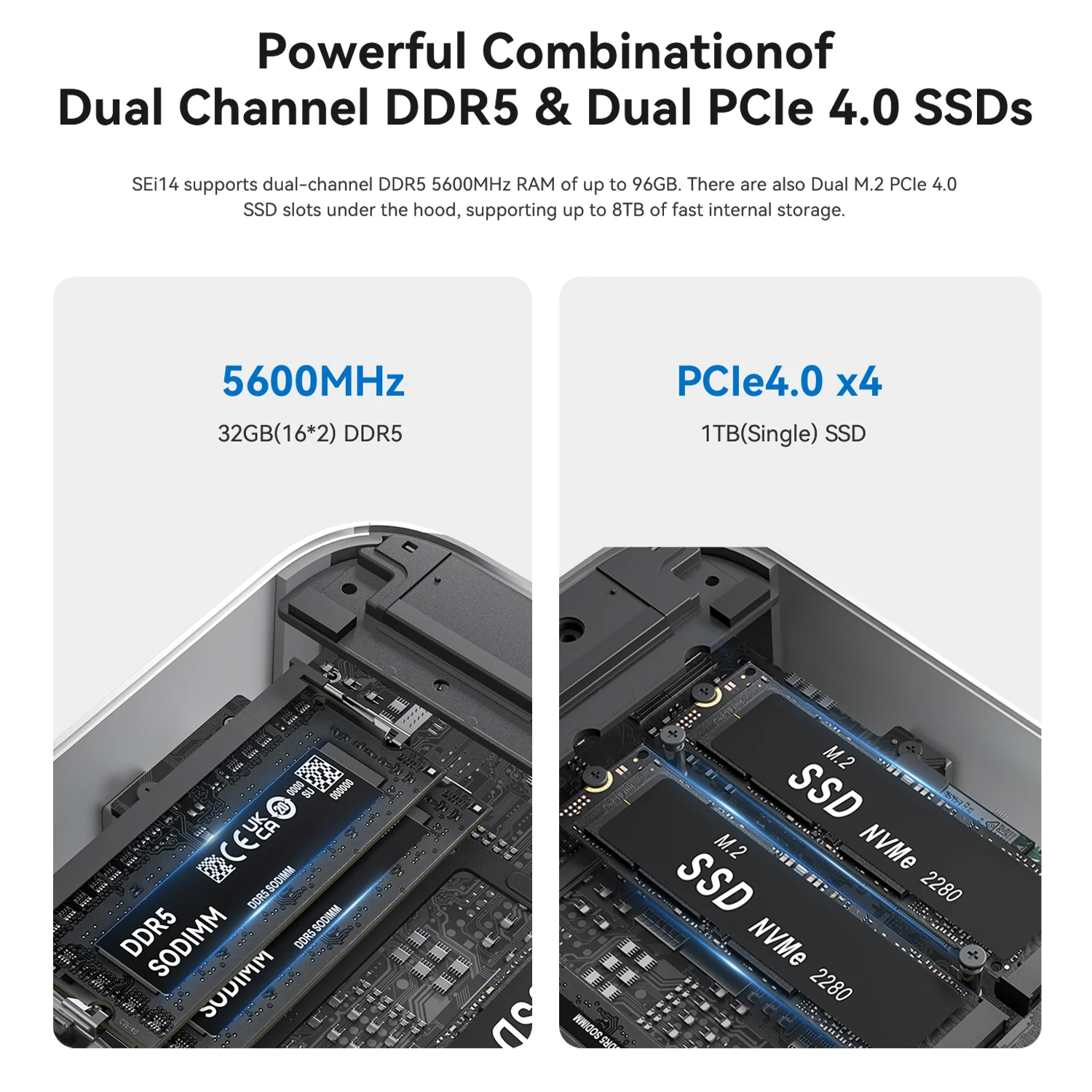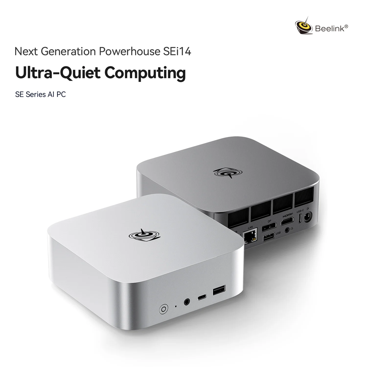 Beelink SEi14 Mini PC : Intel® Core Ultra 5 125H | 32GB DDR5 RAM ; 1TB PCIe 4.0 SSD | Intel® Arc Graphics | Triple 4K Display, WiFi 6 & Bluetooth 5.2 | DOS | Frost Silver
