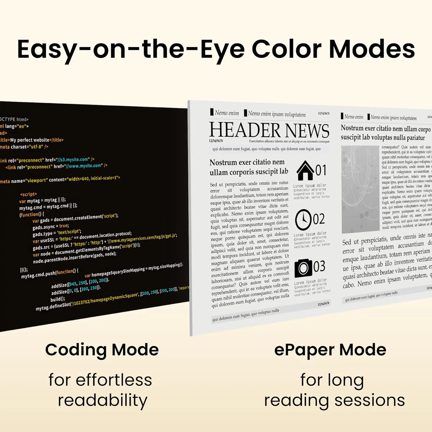 - Multiple Color Modes – Standard, Game, ePaper, Coding, and Cinema modes optimize visuals for different tasks.