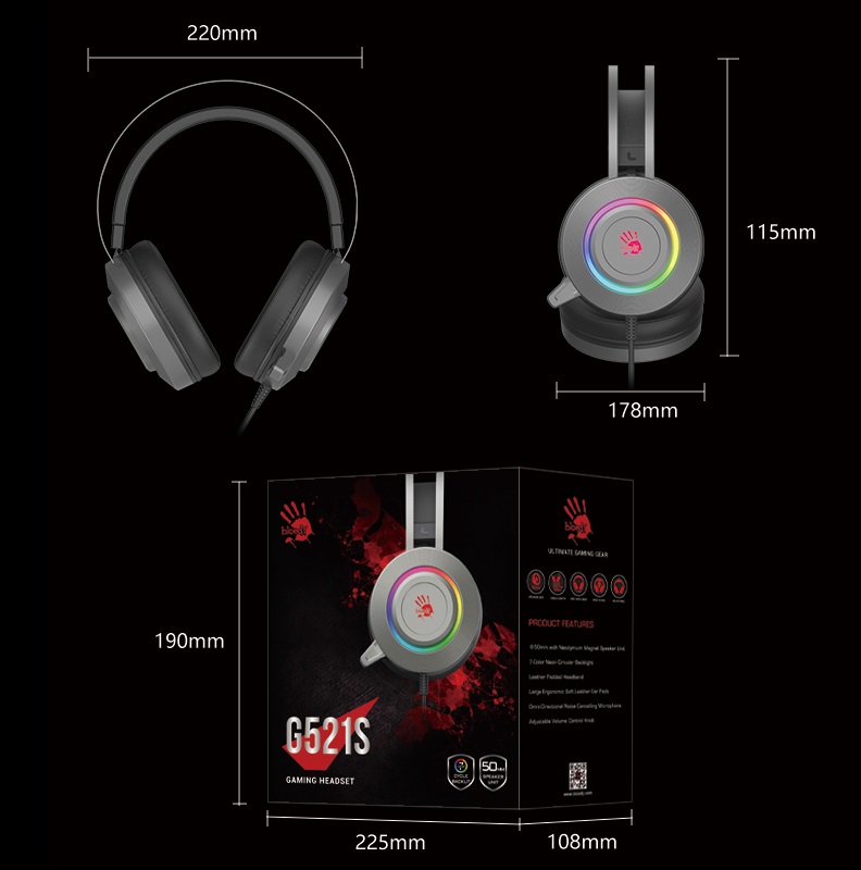 bloody G521S RGB Gaming Headset , 50 mm speaker , Omni-Directional Noise-Canceling Mic. , Suspended Headband , 7-Color Circular Breathing Light , 230 cm USB Cable – Sliver BlackĀ