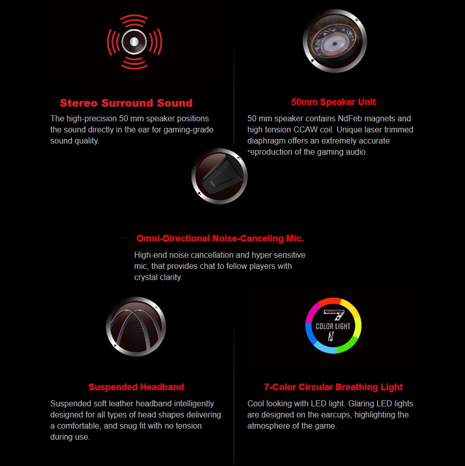 - 7-Color Circular Breathing Light : Cool looking with LED light. Glaring LED lights are designed on the earcups, highlighting the atmosphere of the game.