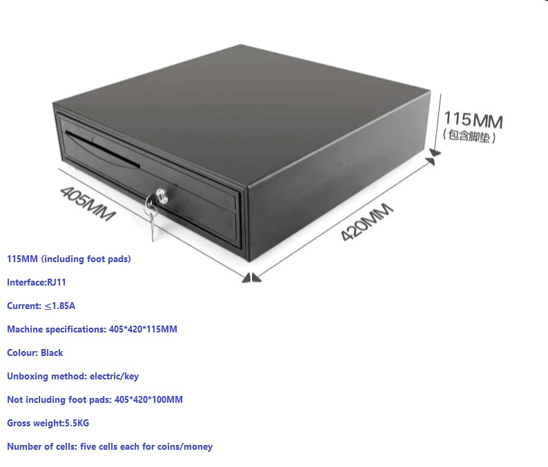 - cash register drawer measures 405*420*115MM (a including rubber legs), voltage is at 24 VDC and comes with a micro switch.