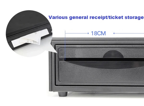 - It is designed for more secure and flexible cash counting and handling. The front panel has 2 media compartments for large bills, checks, and receipts storage without opening the drawer.