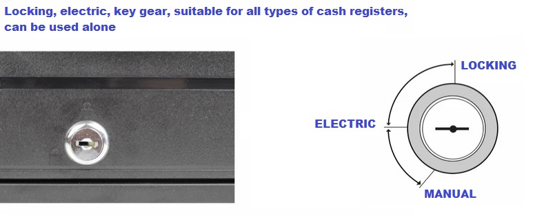 - Our cash box with money tray and lock is secured with 3-position key lock: 1-manual open, 2-auto open by printer/POS, 3-lock.