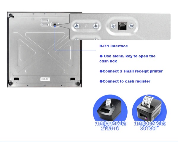 - Just connect the cash drawer to a receipt printer via the RJ11 cable included in the package, and then to your POS to automatically open or close cash trays.