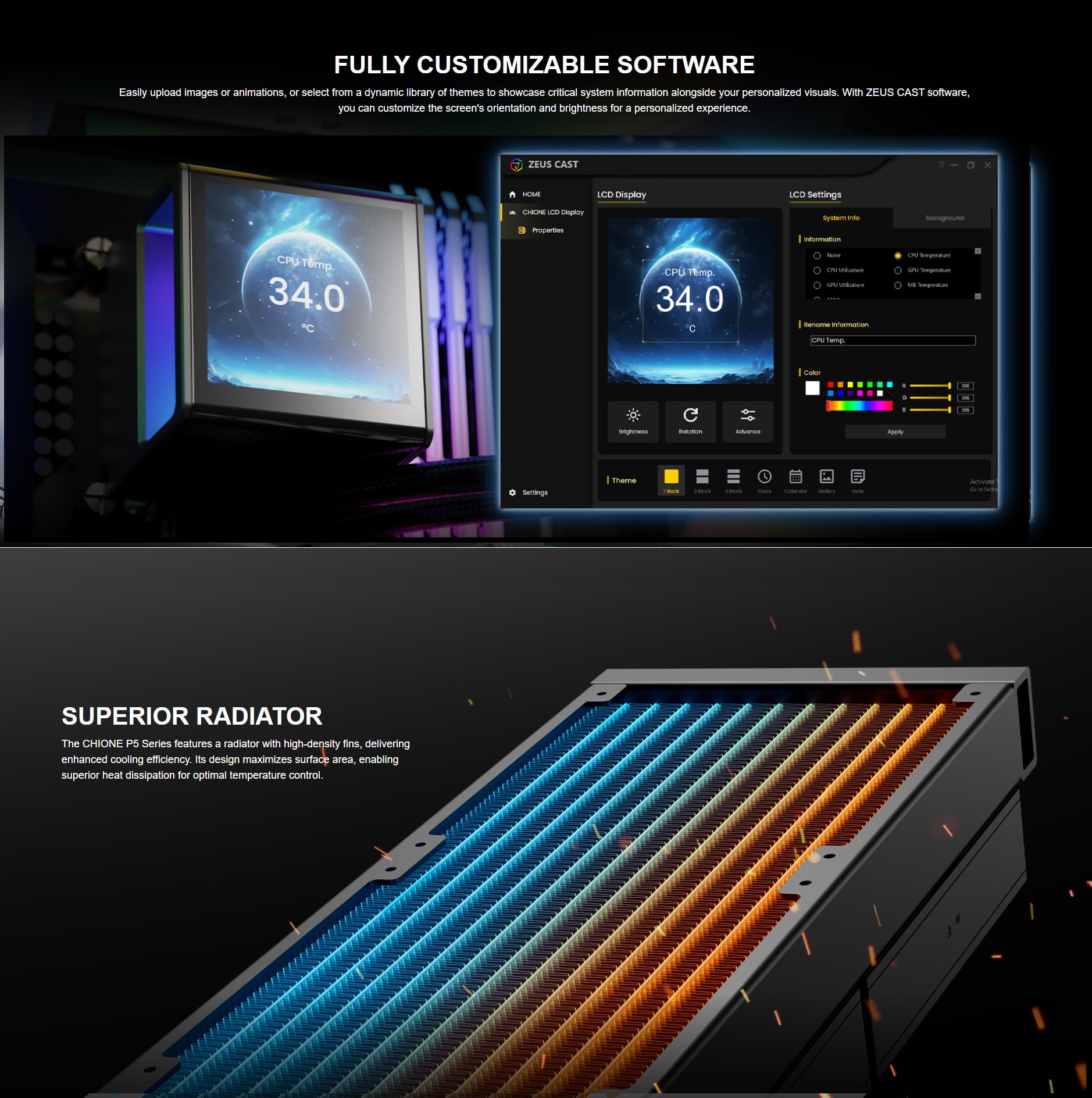 - ZEUS CAST Customization Software – Personalize themes, brightness, and display settings.