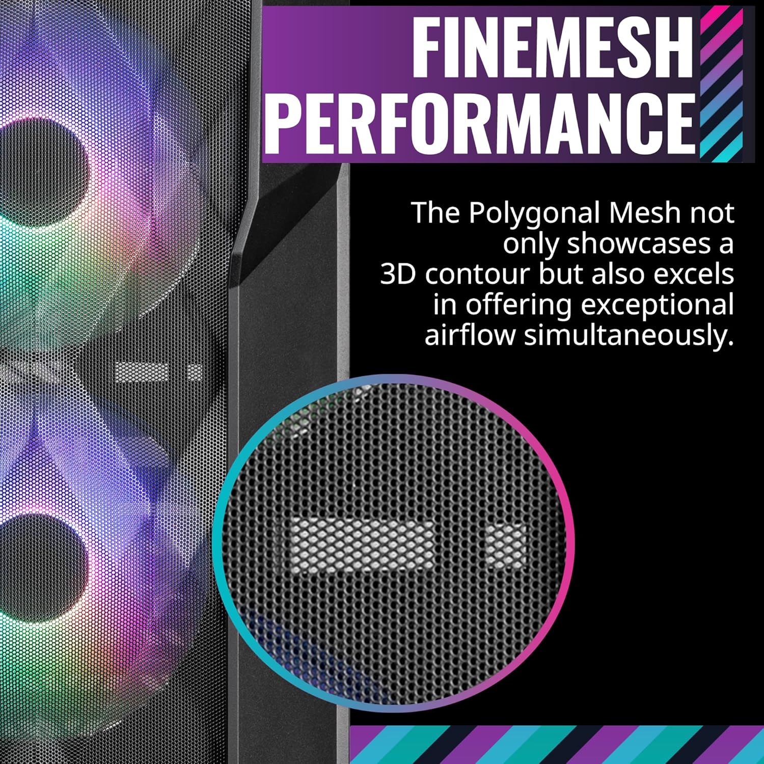 - Polygonal FineMesh Front Panel : Iconic 3D polygonal FineMesh design delivers high airflow while maintaining effective dust filtration and a visually striking front profile