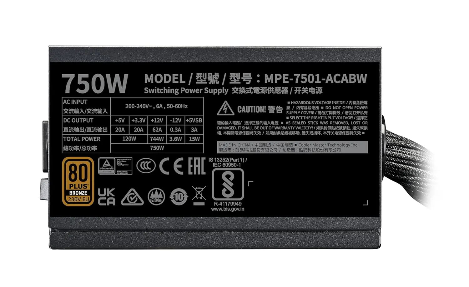 Cooler Master MWE Bronze 750W Non-Modular ATX 3.1 Power Supply , 80 PLUS Bronze Efficiency, Active PFC, 120mm HDB Fan, Comprehensive Protections (UVP, OVP, OPP, OTP, SCP), V3 230V | BLACK