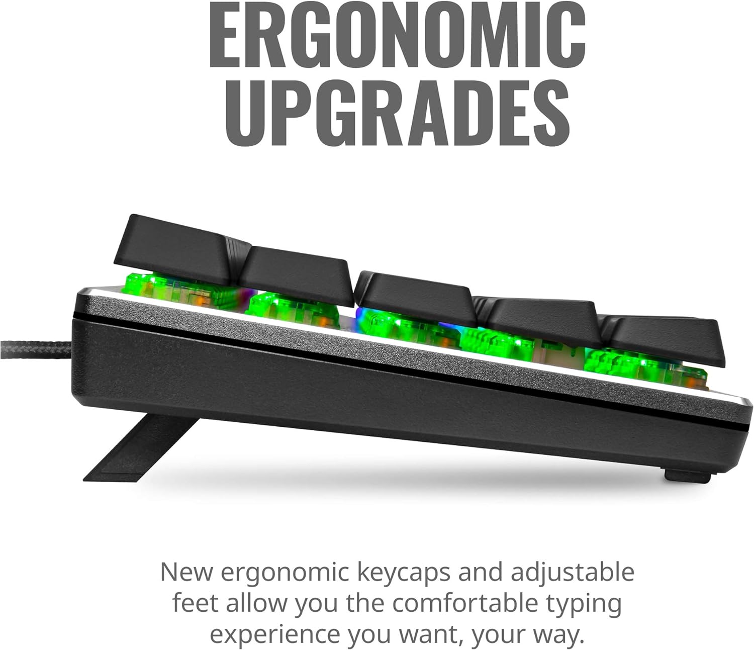 - Ergonomic Upgrades – New ergonomic keycaps and adjustable feet allow you the comfortable typing experience you want, your way.